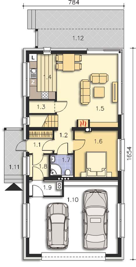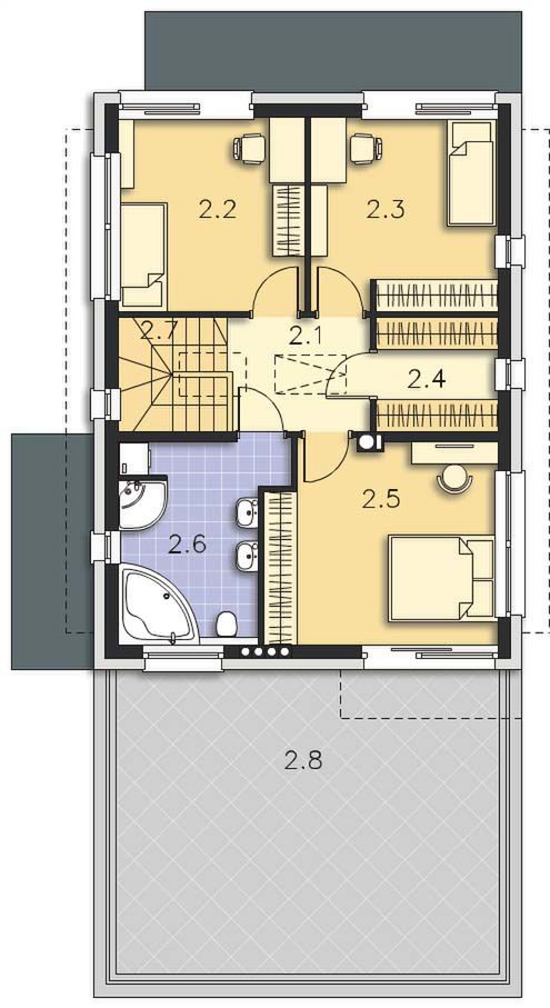 Graficzne opracowanie rzutów poglądowych widocznych na karcie projektu zostało wykonane przez Extradom.pl. Prezentowane przez Extradom.pl wizualizacje wykonane zostały przez autora projektu i należy poczytywać je jedynie za przykład i propozycję wykończenia, wizję architektoniczną autora projektu. Ostateczne wykończenie budynku może nastąpić na wiele sposobów. Szczegółowe rozwiązania zastosowane w oferowanej dokumentacji - w tym również ilość, lokalizacje i wygląd okien, drzwi, kominów - mogą w niewielkim stopniu różnić się od prezentowanej wizualizacji budynku.