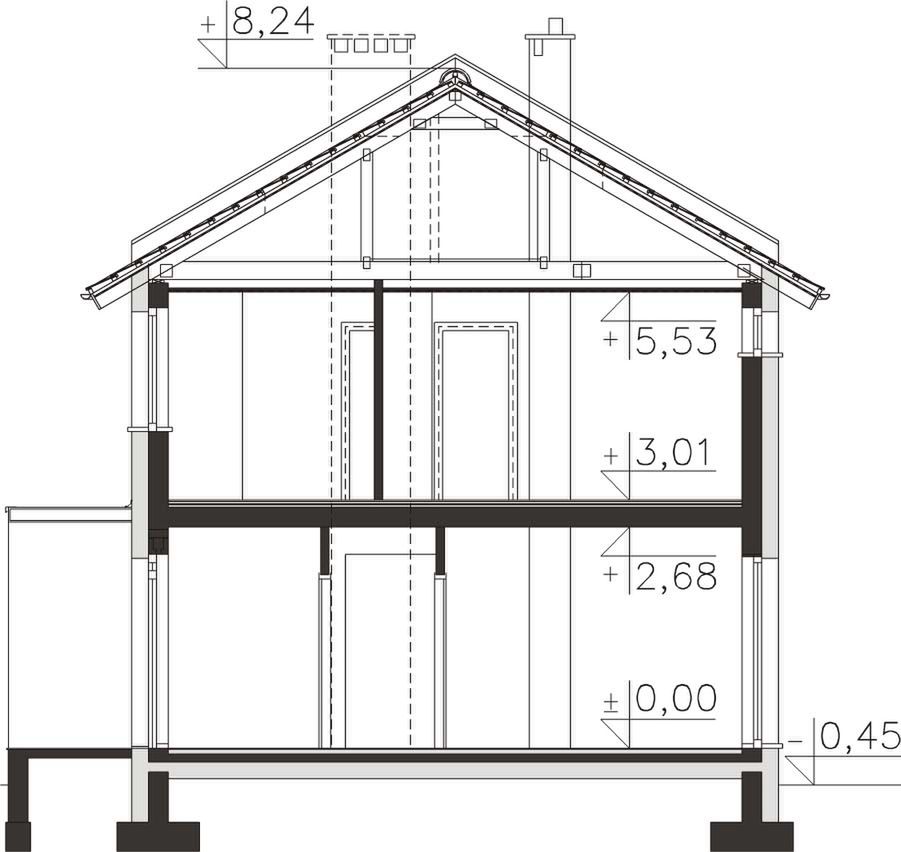 Fundamenty - rozwiązanie o podwyższonej izolacji termicznej. Strop - gęstożebrowy. Dach - wiązary prefabrykowane. Ogrzewanie - c.o. grzejnikowe + c.w.u. - kocioł gazowy. Wentylacja - rekuperacja.
