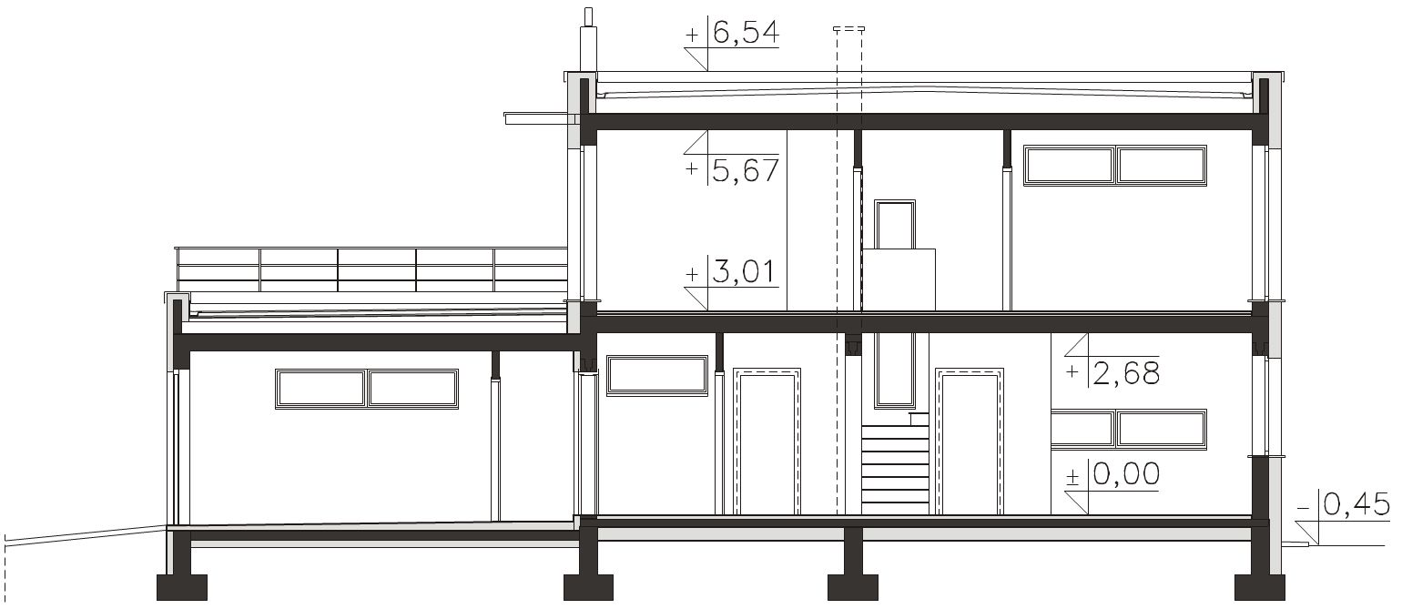 Fundamenty - rozwiązanie o podwyższonej izolacji termicznej. Ściany zewnętrzne - Bloczek silikatowy 24 cm + styropian 20 cm. Dach - stropodach gęstożebrowy. Ogrzewanie - c.o. grzejnikowe + c.w.u. - kocioł gazowy. Wentylacja - rekuperacja.