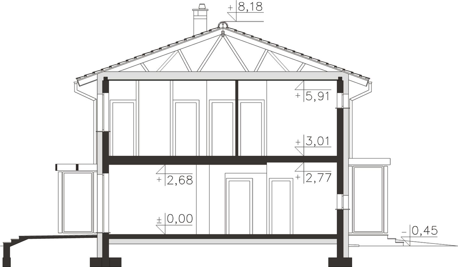 Fundamenty - rozwiązanie o podwyższonej izolacji termicznej. Ściany zewnętrzne - Bloczek silikatowy 24 cm + styropian 20 cm. Strop - gęstożebrowy. Dach - wiązary prefabrykowane. Ogrzewanie - c.o. grzejnikowe + c.w.u. - kocioł gazowy. Wentylacja - grawitacyjna.