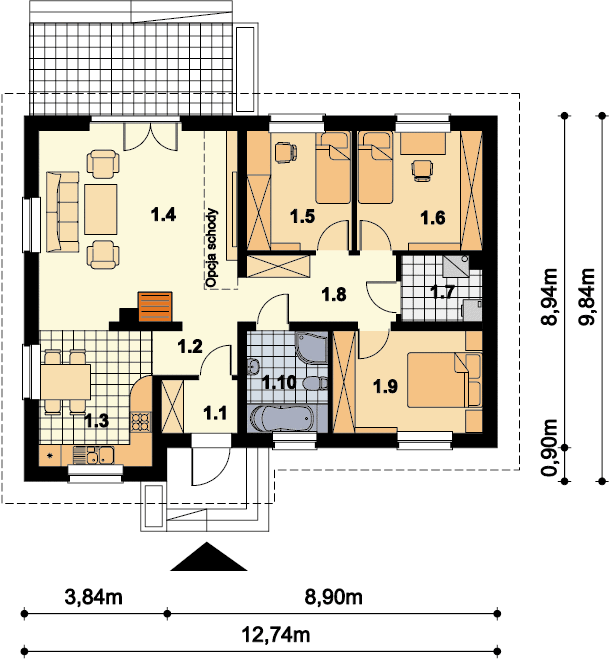 Graficzne opracowanie rzutów poglądowych widocznych na karcie projektu zostało wykonane przez Extradom.pl. Prezentowane przez Extradom.pl wizualizacje wykonane zostały przez autora projektu i należy poczytywać je jedynie za przykład i propozycję wykończenia, wizję architektoniczną autora projektu. Ostateczne wykończenie budynku może nastąpić na wiele sposobów. Szczegółowe rozwiązania zastosowane w oferowanej dokumentacji - w tym również ilość, lokalizacje i wygląd okien, drzwi, kominów - mogą w niewielkim stopniu różnić się od prezentowanej wizualizacji budynku.