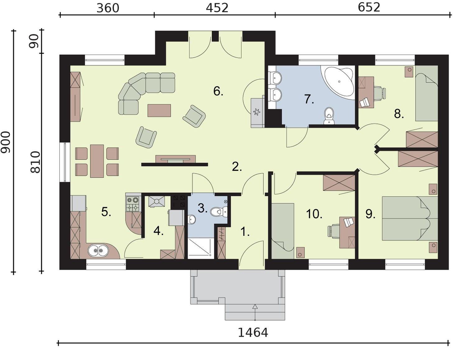 Graficzne opracowanie rzutów poglądowych widocznych na karcie projektu zostało wykonane przez Extradom.pl. Prezentowane przez Extradom.pl wizualizacje wykonane zostały przez autora projektu i należy poczytywać je jedynie za przykład i propozycję wykończenia, wizję architektoniczną autora projektu. Ostateczne wykończenie budynku może nastąpić na wiele sposobów. Szczegółowe rozwiązania zastosowane w oferowanej dokumentacji - w tym również ilość, lokalizacje i wygląd okien, drzwi, kominów - mogą w niewielkim stopniu różnić się od prezentowanej wizualizacji budynku.