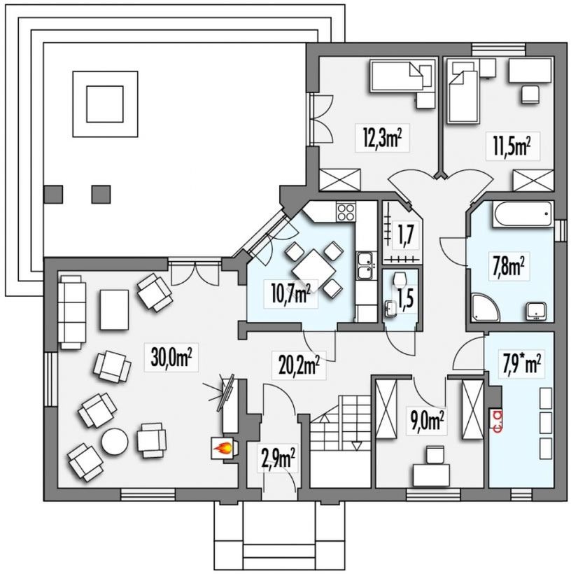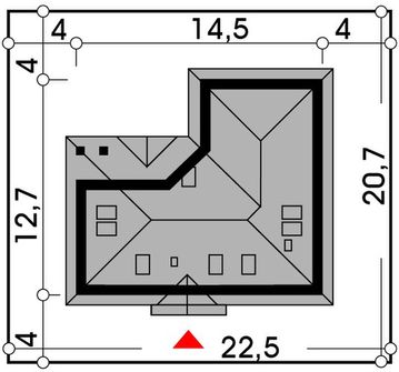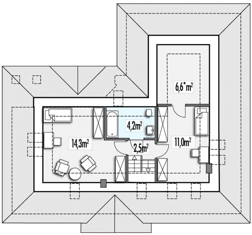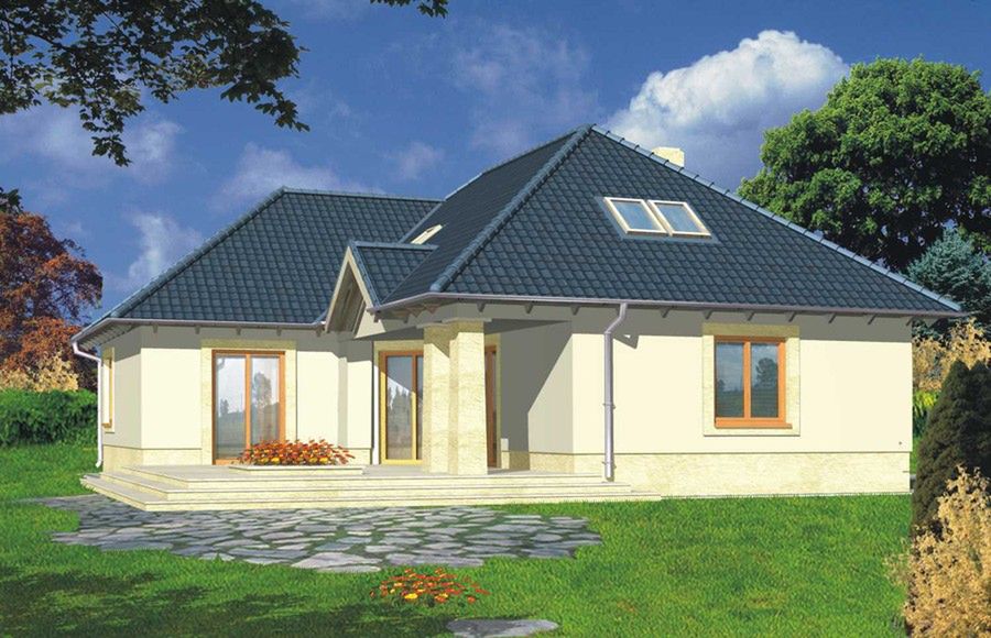 Graficzne opracowanie rzutów poglądowych widocznych na karcie projektu zostało wykonane przez Extradom.pl. Prezentowane przez Extradom.pl wizualizacje wykonane zostały przez autora projektu i należy poczytywać je jedynie za przykład i propozycję wykończenia, wizję architektoniczną autora projektu. Ostateczne wykończenie budynku może nastąpić na wiele sposobów. Szczegółowe rozwiązania zastosowane w oferowanej dokumentacji - w tym również ilość, lokalizacje i wygląd okien, drzwi, kominów - mogą w niewielkim stopniu różnić się od prezentowanej wizualizacji budynku.
