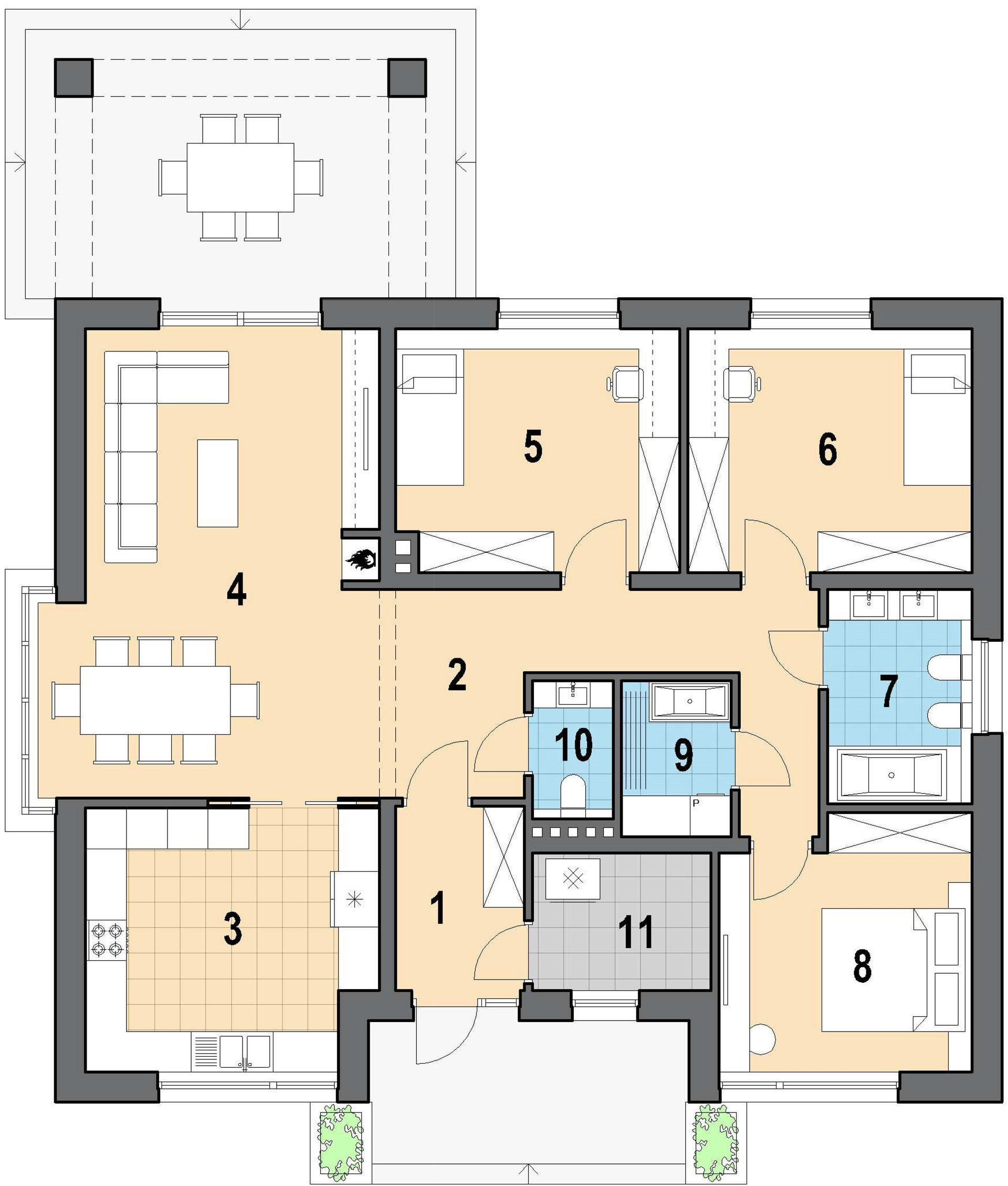 Graficzne opracowanie rzutów poglądowych widocznych na karcie projektu zostało wykonane przez Extradom.pl. Prezentowane przez Extradom.pl wizualizacje wykonane zostały przez autora projektu i należy poczytywać je jedynie za przykład i propozycję wykończenia, wizję architektoniczną autora projektu. Ostateczne wykończenie budynku może nastąpić na wiele sposobów. Szczegółowe rozwiązania zastosowane w oferowanej dokumentacji - w tym również ilość, lokalizacje i wygląd okien, drzwi, kominów - mogą w niewielkim stopniu różnić się od prezentowanej wizualizacji budynku.