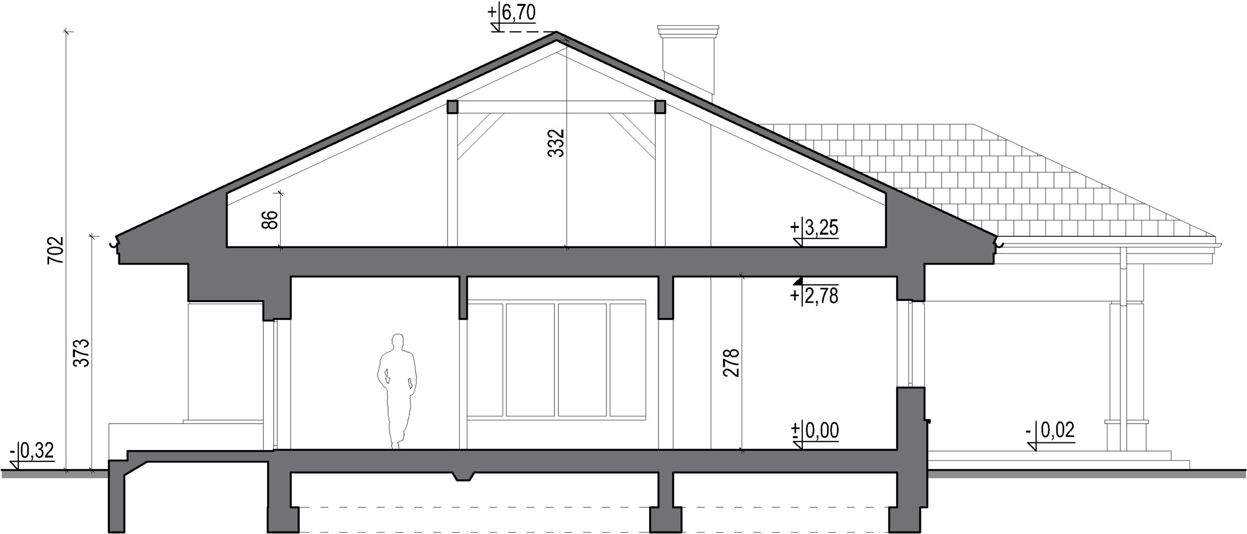 Ściany: pustak z bet. komórkowego 24 cm + styropian 20 cm. Strop: żelbetowy monolityczne. Więźba dachowa: drewniana. Pokrycie dachu: dachówka ceramiczna płaska.