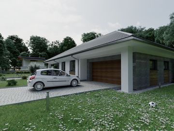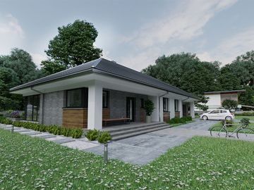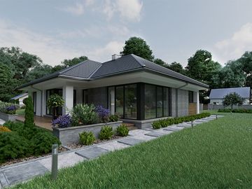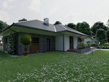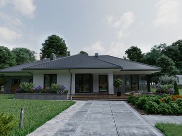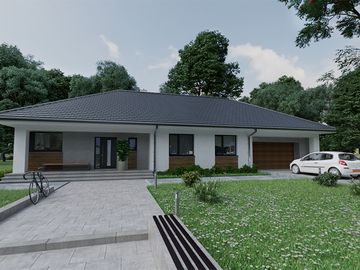 Graficzne opracowanie rzutów poglądowych widocznych na karcie projektu zostało wykonane przez Extradom.pl. Prezentowane przez Extradom.pl wizualizacje wykonane zostały przez autora projektu i należy poczytywać je jedynie za przykład i propozycję wykończenia, wizję architektoniczną autora projektu. Ostateczne wykończenie budynku może nastąpić na wiele sposobów. Szczegółowe rozwiązania zastosowane w oferowanej dokumentacji - w tym również ilość, lokalizacje i wygląd okien, drzwi, kominów - mogą w niewielkim stopniu różnić się od prezentowanej wizualizacji budynku.