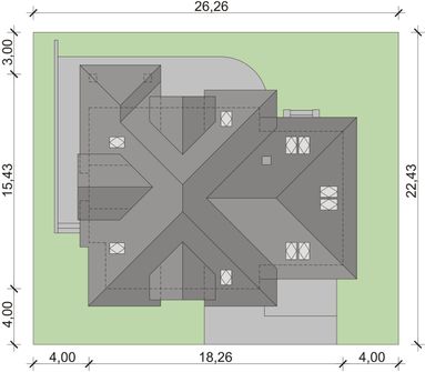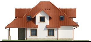 Graficzne opracowanie rzutów poglądowych widocznych na karcie projektu zostało wykonane przez Extradom.pl. Prezentowane przez Extradom.pl wizualizacje wykonane zostały przez autora projektu i należy poczytywać je jedynie za przykład i propozycję wykończenia, wizję architektoniczną autora projektu. Ostateczne wykończenie budynku może nastąpić na wiele sposobów. Szczegółowe rozwiązania zastosowane w oferowanej dokumentacji - w tym również ilość, lokalizacje i wygląd okien, drzwi, kominów - mogą w niewielkim stopniu różnić się od prezentowanej wizualizacji budynku.