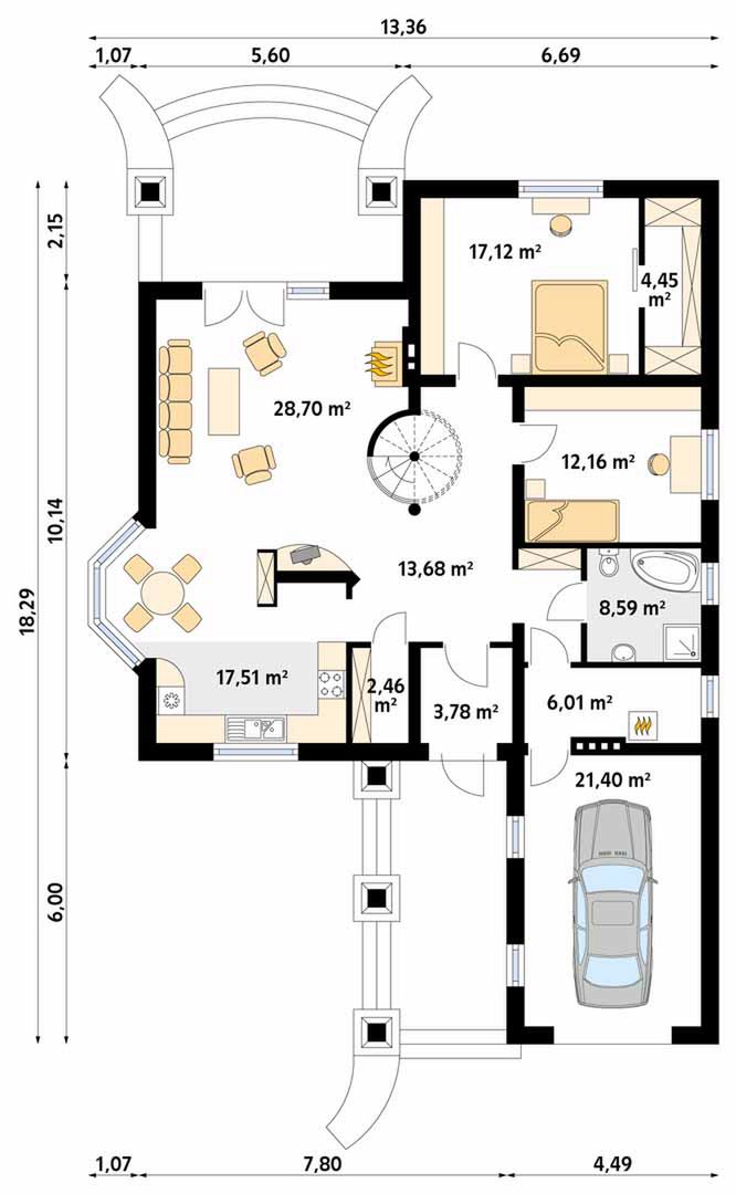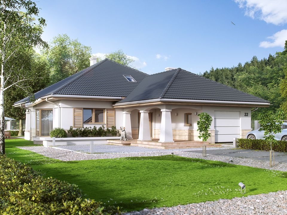 Graficzne opracowanie rzutów poglądowych widocznych na karcie projektu zostało wykonane przez Extradom.pl. Prezentowane przez Extradom.pl wizualizacje wykonane zostały przez autora projektu i należy poczytywać je jedynie za przykład i propozycję wykończenia, wizję architektoniczną autora projektu. Ostateczne wykończenie budynku może nastąpić na wiele sposobów. Szczegółowe rozwiązania zastosowane w oferowanej dokumentacji - w tym również ilość, lokalizacje i wygląd okien, drzwi, kominów - mogą w niewielkim stopniu różnić się od prezentowanej wizualizacji budynku.