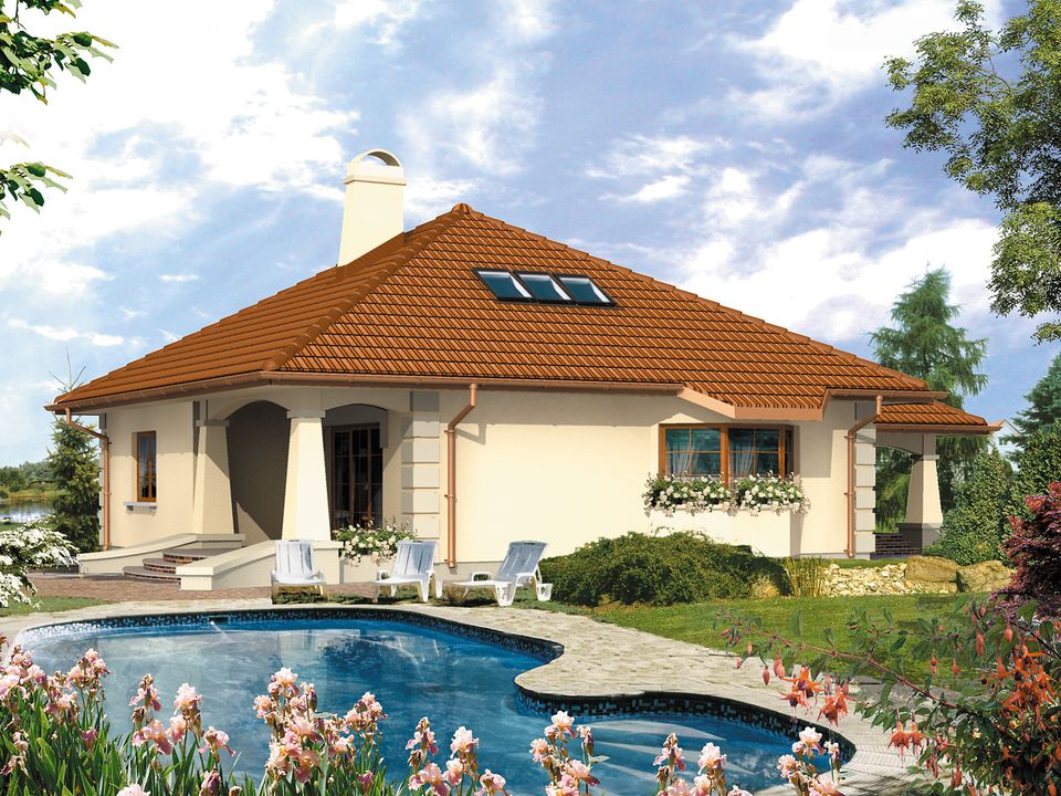 Dach: dachówka, kąt nachylenia 30°. Stropy: żelbetowe, wylewane. Ściany: 2-warstwowe - pustak ceramiczny + styropian. Ogrzewanie: gazowe.