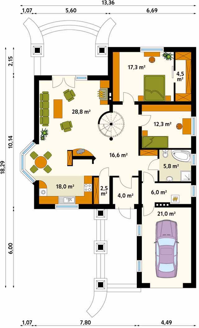 Graficzne opracowanie rzutów poglądowych widocznych na karcie projektu zostało wykonane przez Extradom.pl. Prezentowane przez Extradom.pl wizualizacje wykonane zostały przez autora projektu i należy poczytywać je jedynie za przykład i propozycję wykończenia, wizję architektoniczną autora projektu. Ostateczne wykończenie budynku może nastąpić na wiele sposobów. Szczegółowe rozwiązania zastosowane w oferowanej dokumentacji - w tym również ilość, lokalizacje i wygląd okien, drzwi, kominów - mogą w niewielkim stopniu różnić się od prezentowanej wizualizacji budynku.