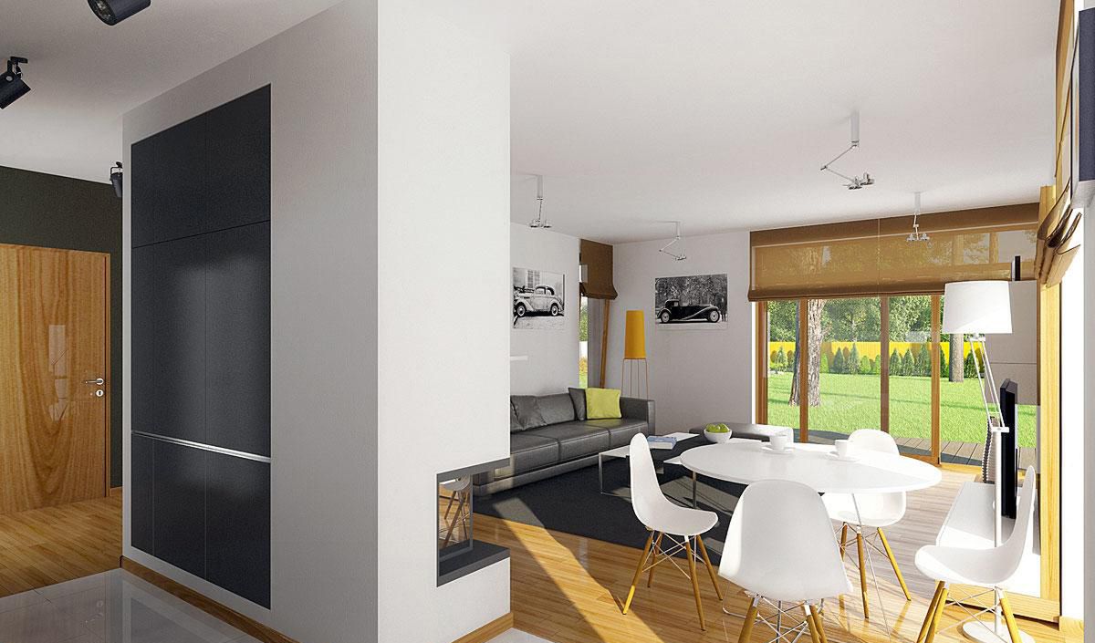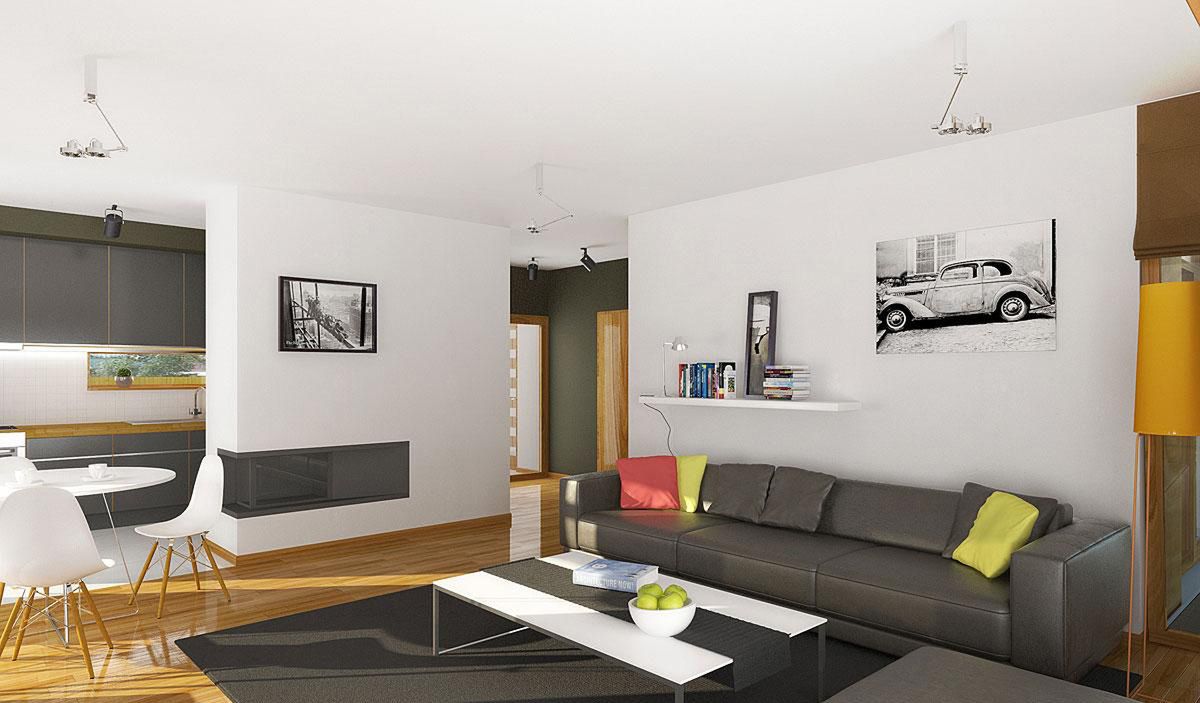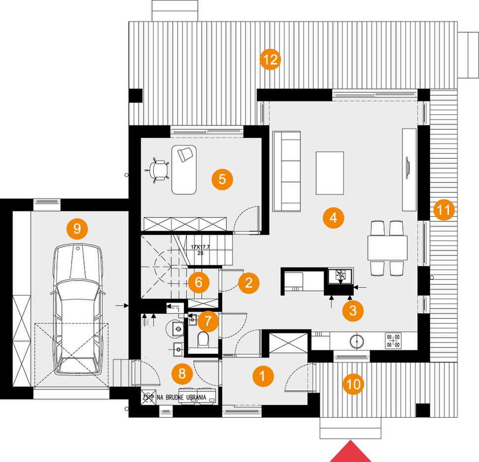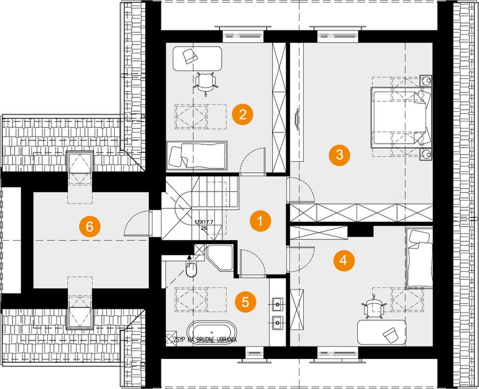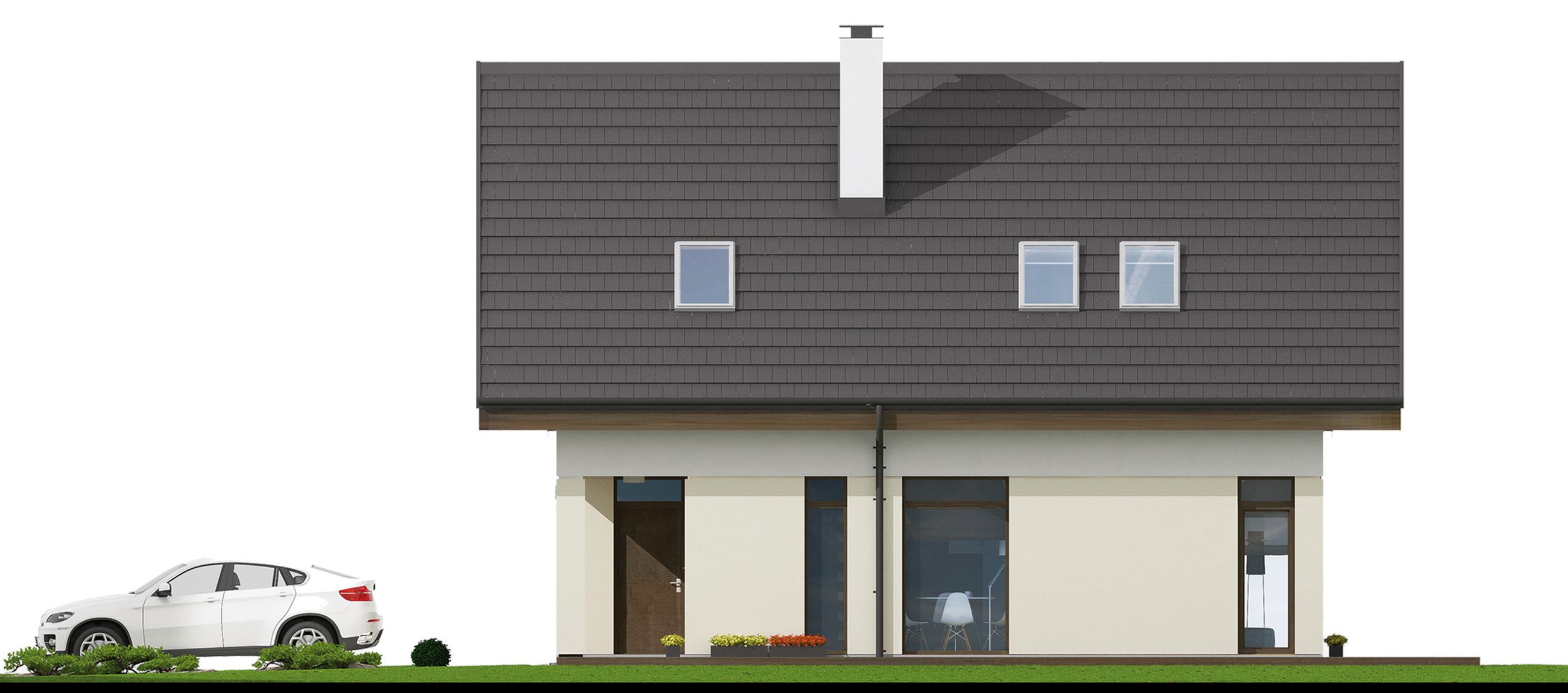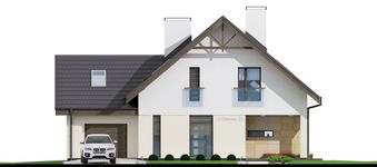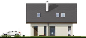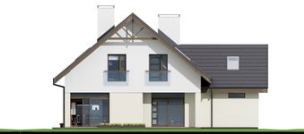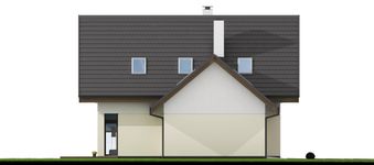 Graficzne opracowanie rzutów poglądowych widocznych na karcie projektu zostało wykonane przez Extradom.pl. Prezentowane przez Extradom.pl wizualizacje wykonane zostały przez autora projektu i należy poczytywać je jedynie za przykład i propozycję wykończenia, wizję architektoniczną autora projektu. Ostateczne wykończenie budynku może nastąpić na wiele sposobów. Szczegółowe rozwiązania zastosowane w oferowanej dokumentacji - w tym również ilość, lokalizacje i wygląd okien, drzwi, kominów - mogą w niewielkim stopniu różnić się od prezentowanej wizualizacji budynku.