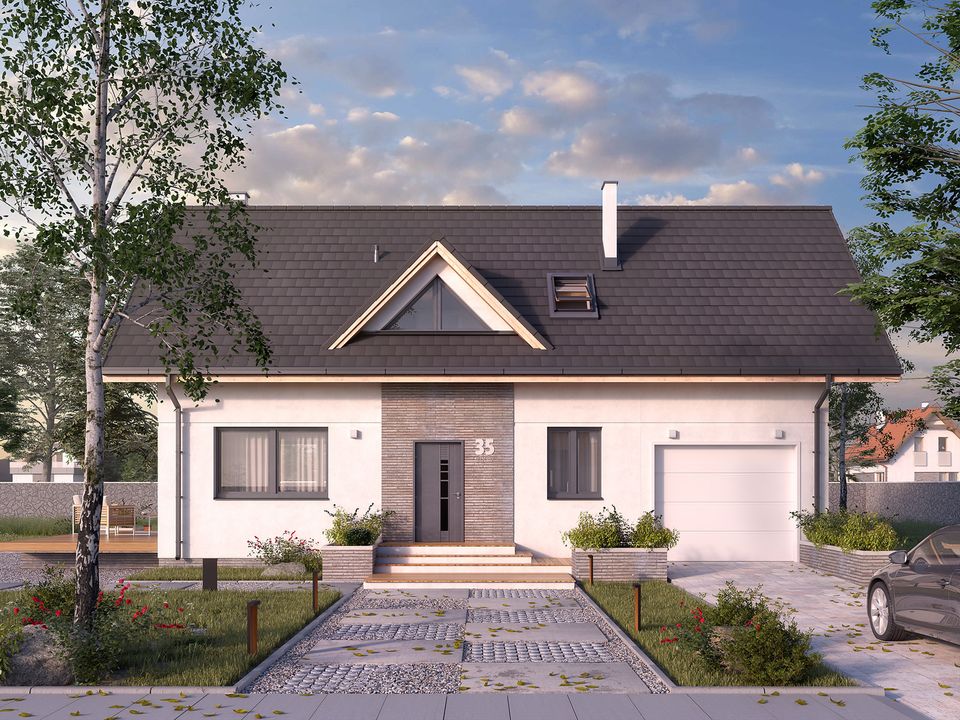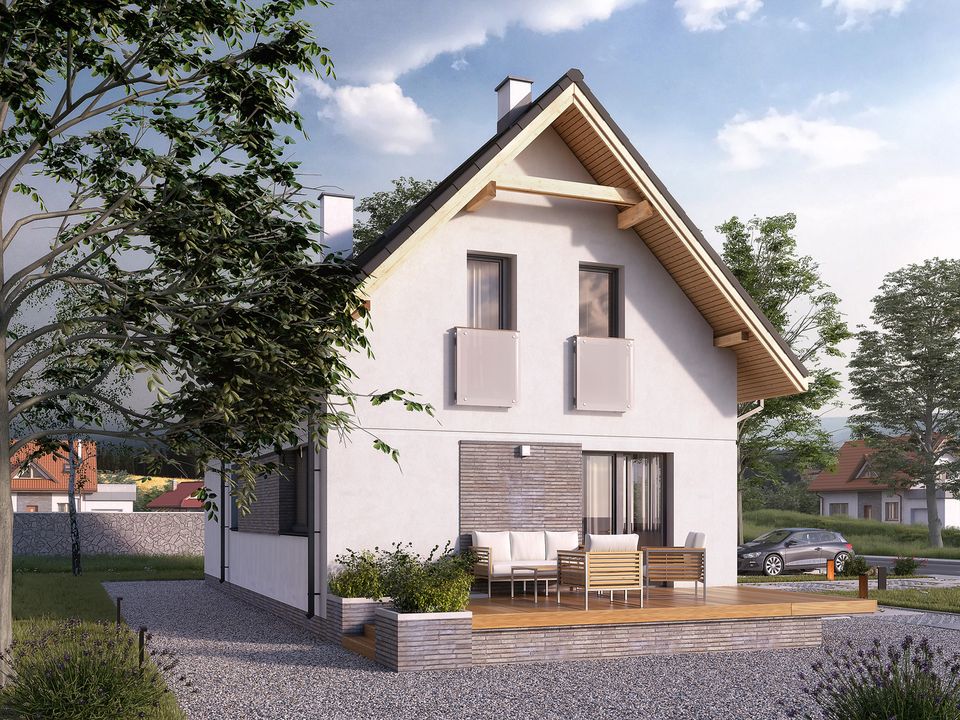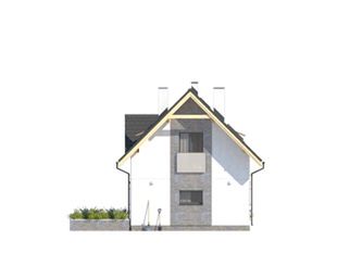 Graficzne opracowanie rzutów poglądowych widocznych na karcie projektu zostało wykonane przez Extradom.pl. Prezentowane przez Extradom.pl wizualizacje wykonane zostały przez autora projektu i należy poczytywać je jedynie za przykład i propozycję wykończenia, wizję architektoniczną autora projektu. Ostateczne wykończenie budynku może nastąpić na wiele sposobów. Szczegółowe rozwiązania zastosowane w oferowanej dokumentacji - w tym również ilość, lokalizacje i wygląd okien, drzwi, kominów - mogą w niewielkim stopniu różnić się od prezentowanej wizualizacji budynku.