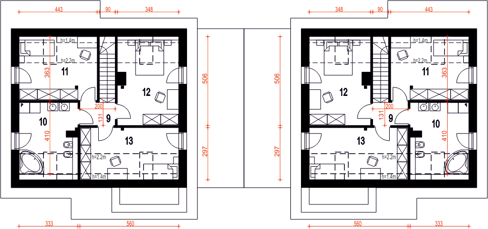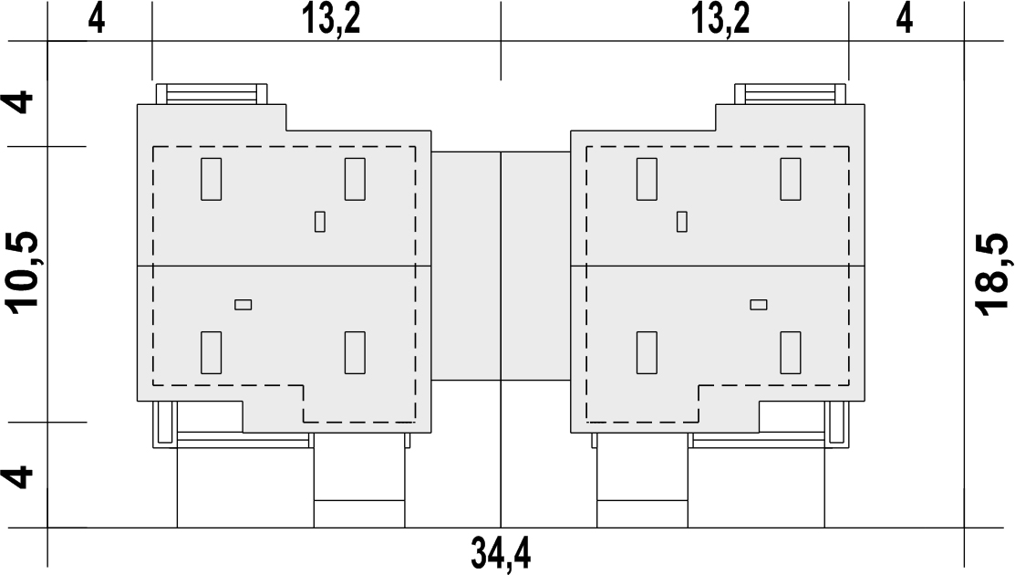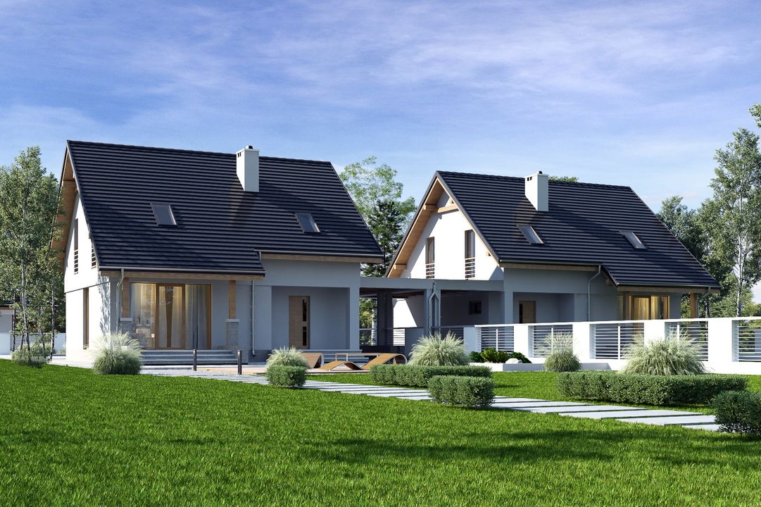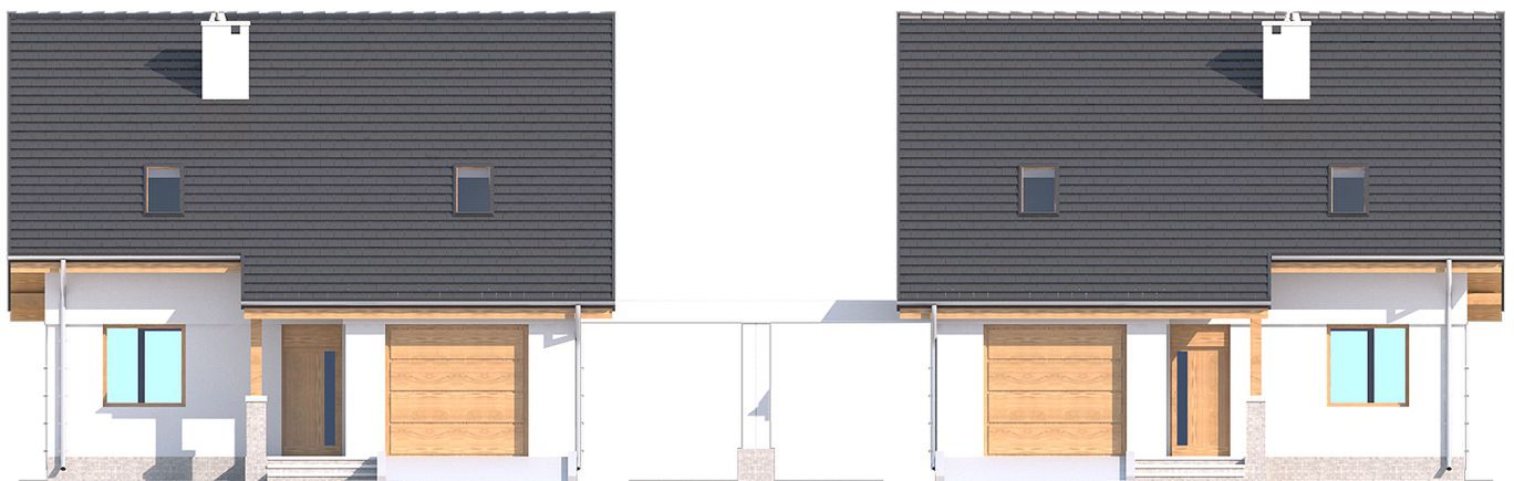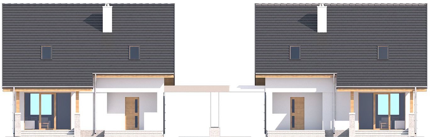 Projekt wymaga aktualizacji. Przy zakupie projektu należy zapłacić 50% zaliczki. Zaliczka jest bezzwrotna w przypadku zwrotu lub rezygnacji z zamówienia. Budynek dwulokalowy posadowiony na wspólnym fundamencie. Jeśli planujesz budowę na osobnych działkach zamów pojedyncze segmenty: podstawa + lustro.