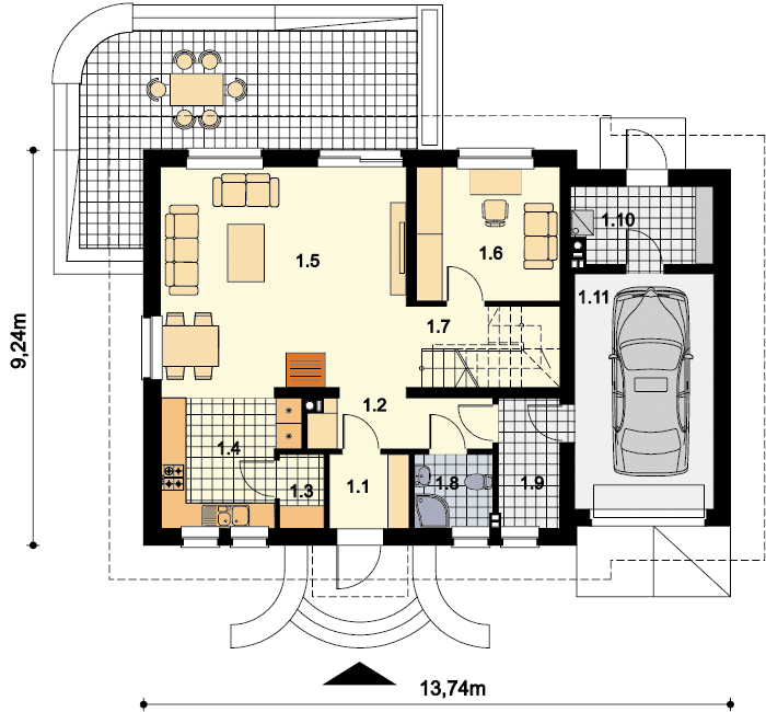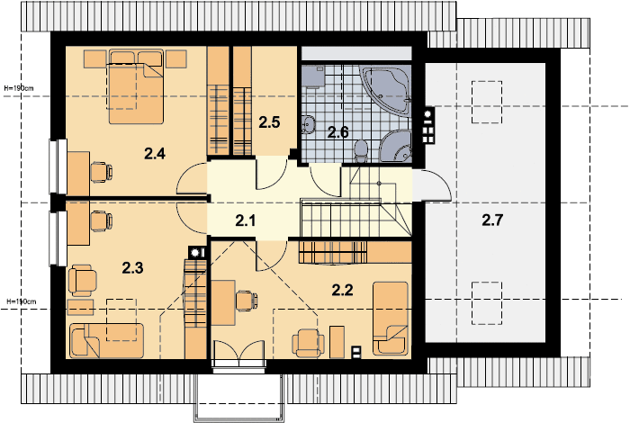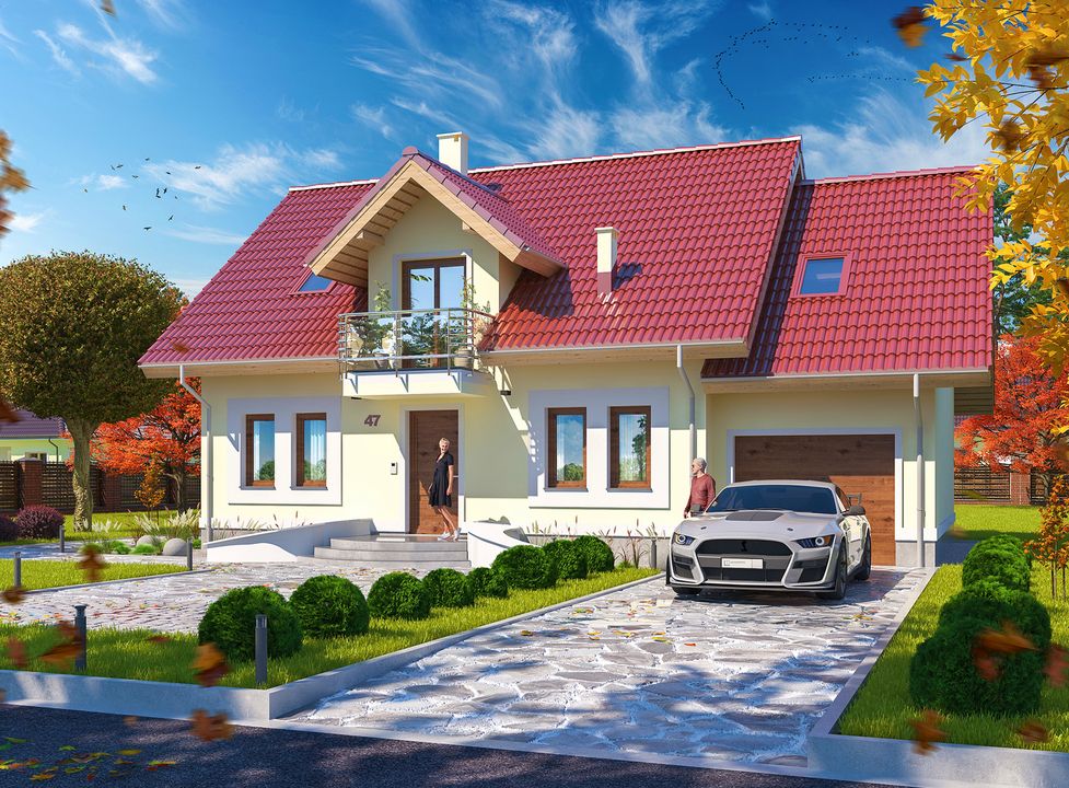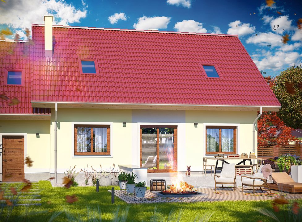 Graficzne opracowanie rzutów poglądowych widocznych na karcie projektu zostało wykonane przez Extradom.pl. Prezentowane przez Extradom.pl wizualizacje wykonane zostały przez autora projektu i należy poczytywać je jedynie za przykład i propozycję wykończenia, wizję architektoniczną autora projektu. Ostateczne wykończenie budynku może nastąpić na wiele sposobów. Szczegółowe rozwiązania zastosowane w oferowanej dokumentacji - w tym również ilość, lokalizacje i wygląd okien, drzwi, kominów - mogą w niewielkim stopniu różnić się od prezentowanej wizualizacji budynku.