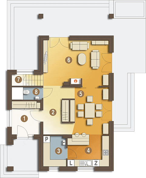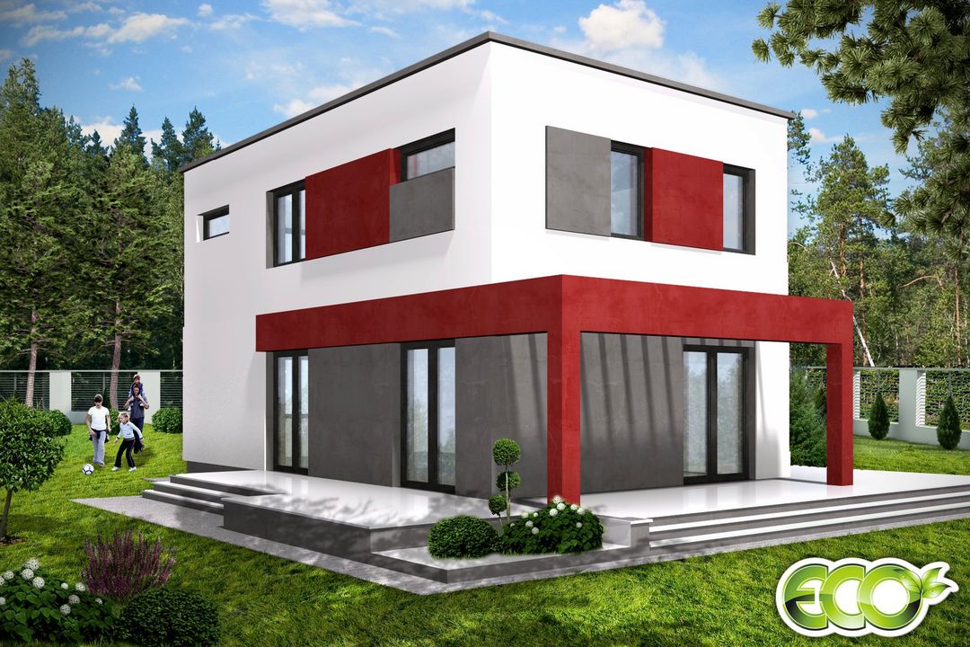 Graficzne opracowanie rzutów poglądowych widocznych na karcie projektu zostało wykonane przez Extradom.pl. Prezentowane przez Extradom.pl wizualizacje wykonane zostały przez autora projektu i należy poczytywać je jedynie za przykład i propozycję wykończenia, wizję architektoniczną autora projektu. Ostateczne wykończenie budynku może nastąpić na wiele sposobów. Szczegółowe rozwiązania zastosowane w oferowanej dokumentacji - w tym również ilość, lokalizacje i wygląd okien, drzwi, kominów - mogą w niewielkim stopniu różnić się od prezentowanej wizualizacji budynku.
