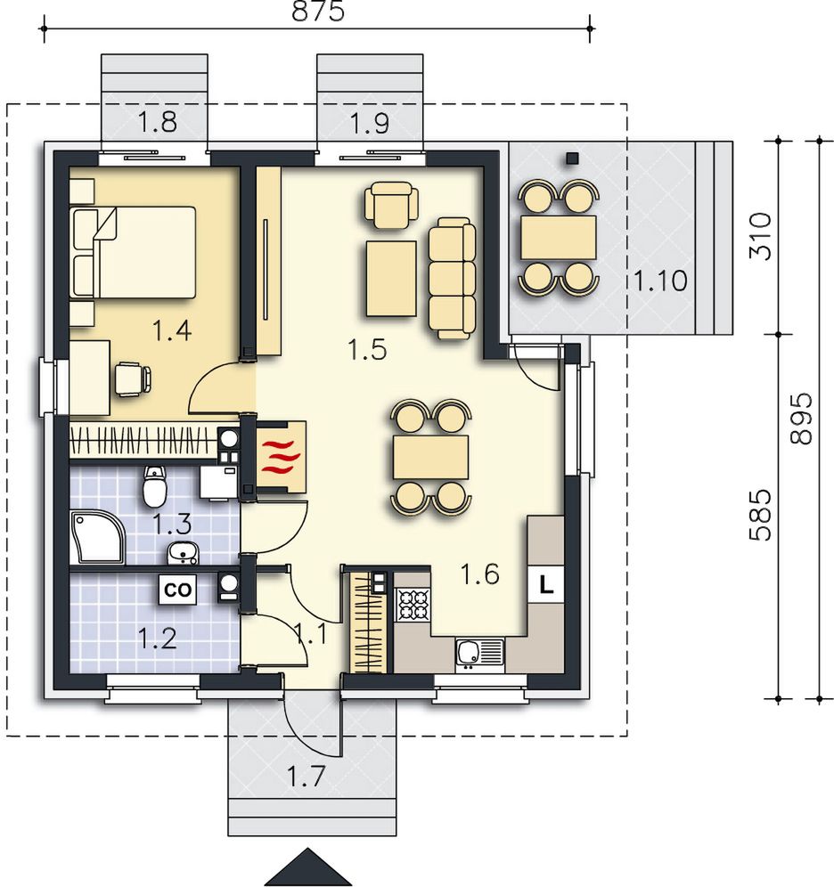 Graficzne opracowanie rzutów poglądowych widocznych na karcie projektu zostało wykonane przez Extradom.pl. Prezentowane przez Extradom.pl wizualizacje wykonane zostały przez autora projektu i należy poczytywać je jedynie za przykład i propozycję wykończenia, wizję architektoniczną autora projektu. Ostateczne wykończenie budynku może nastąpić na wiele sposobów. Szczegółowe rozwiązania zastosowane w oferowanej dokumentacji - w tym również ilość, lokalizacje i wygląd okien, drzwi, kominów - mogą w niewielkim stopniu różnić się od prezentowanej wizualizacji budynku.