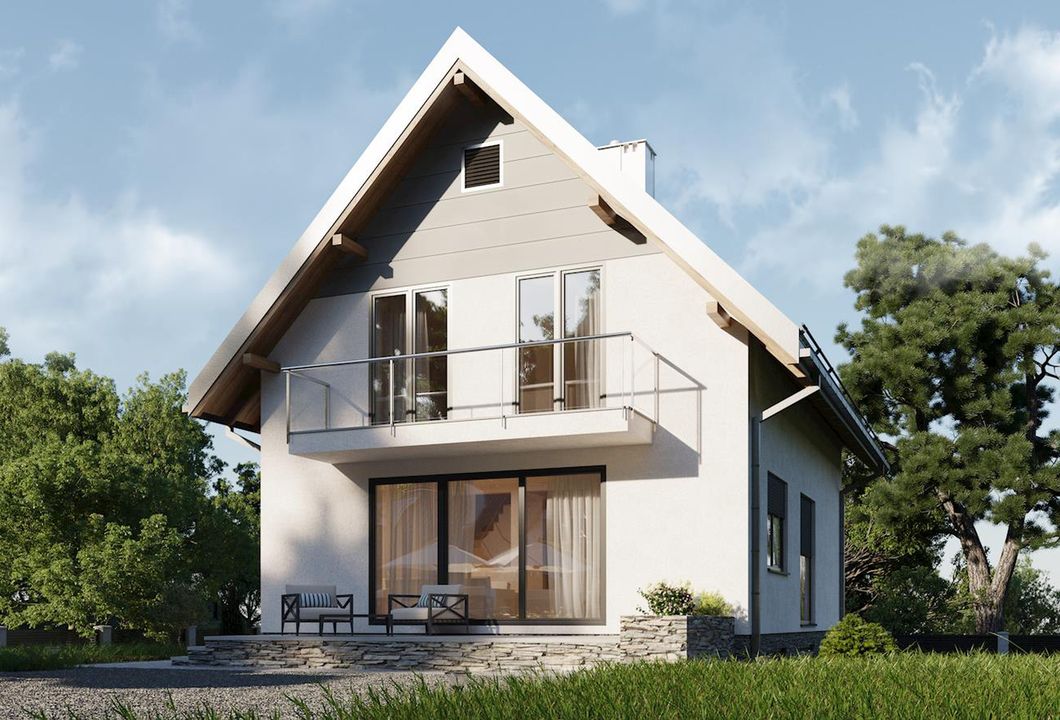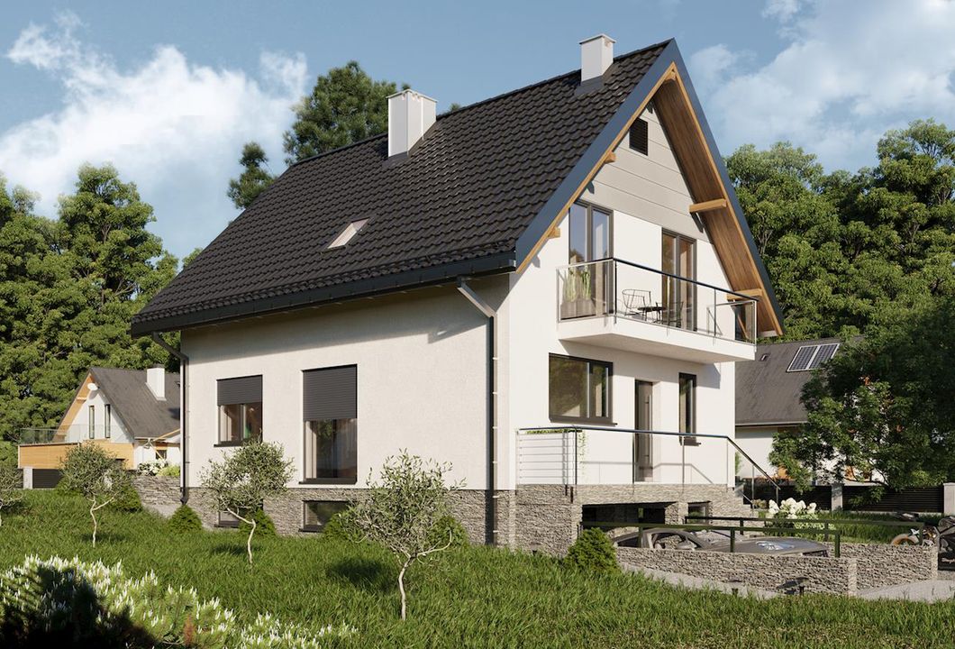 Graficzne opracowanie rzutów poglądowych widocznych na karcie projektu zostało wykonane przez Extradom.pl. Prezentowane przez Extradom.pl wizualizacje wykonane zostały przez autora projektu i należy poczytywać je jedynie za przykład i propozycję wykończenia, wizję architektoniczną autora projektu. Ostateczne wykończenie budynku może nastąpić na wiele sposobów. Szczegółowe rozwiązania zastosowane w oferowanej dokumentacji - w tym również ilość, lokalizacje i wygląd okien, drzwi, kominów - mogą w niewielkim stopniu różnić się od prezentowanej wizualizacji budynku.