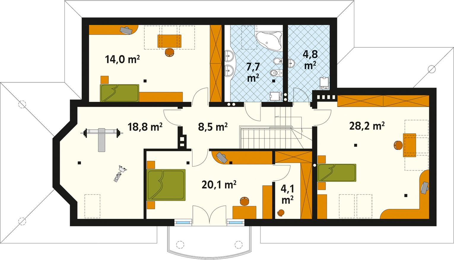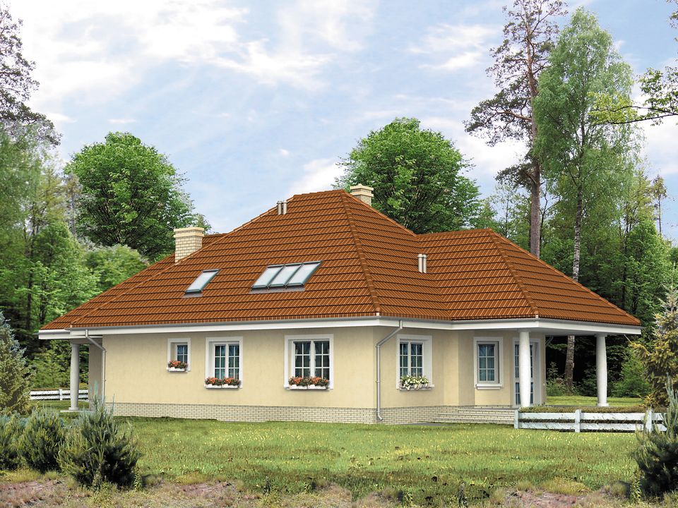 Graficzne opracowanie rzutów poglądowych widocznych na karcie projektu zostało wykonane przez Extradom.pl. Prezentowane przez Extradom.pl wizualizacje wykonane zostały przez autora projektu i należy poczytywać je jedynie za przykład i propozycję wykończenia, wizję architektoniczną autora projektu. Ostateczne wykończenie budynku może nastąpić na wiele sposobów. Szczegółowe rozwiązania zastosowane w oferowanej dokumentacji - w tym również ilość, lokalizacje i wygląd okien, drzwi, kominów - mogą w niewielkim stopniu różnić się od prezentowanej wizualizacji budynku.