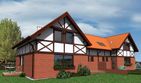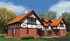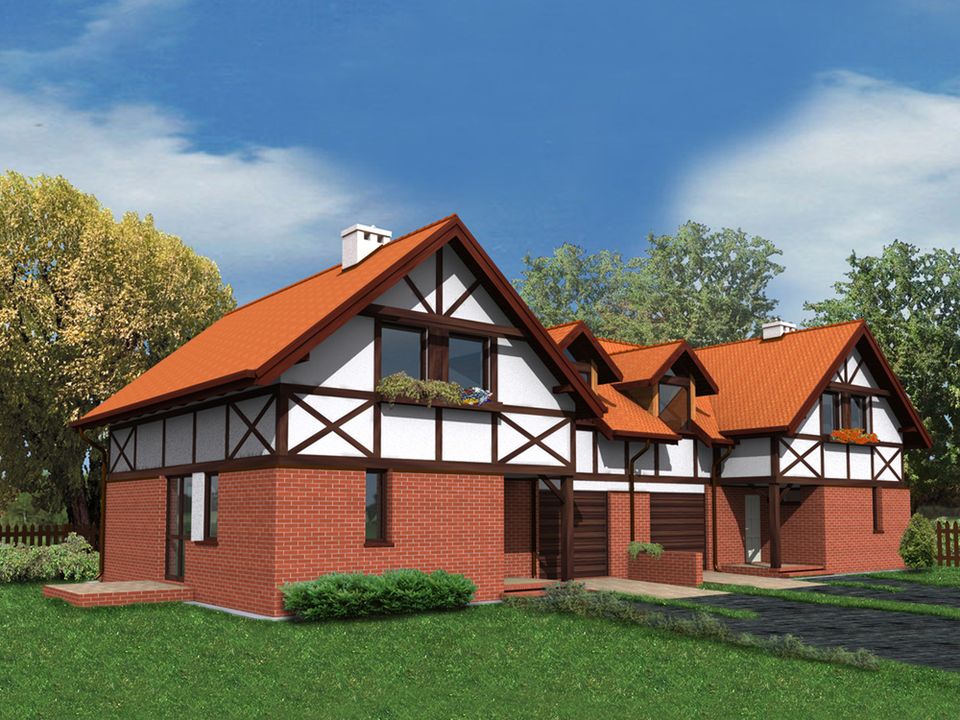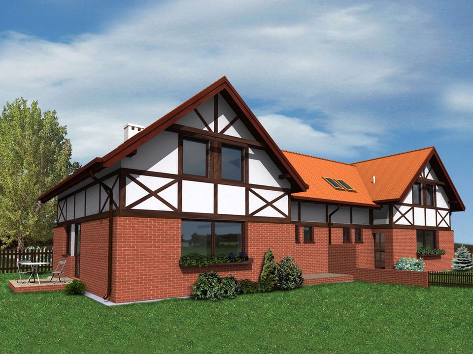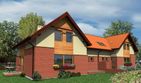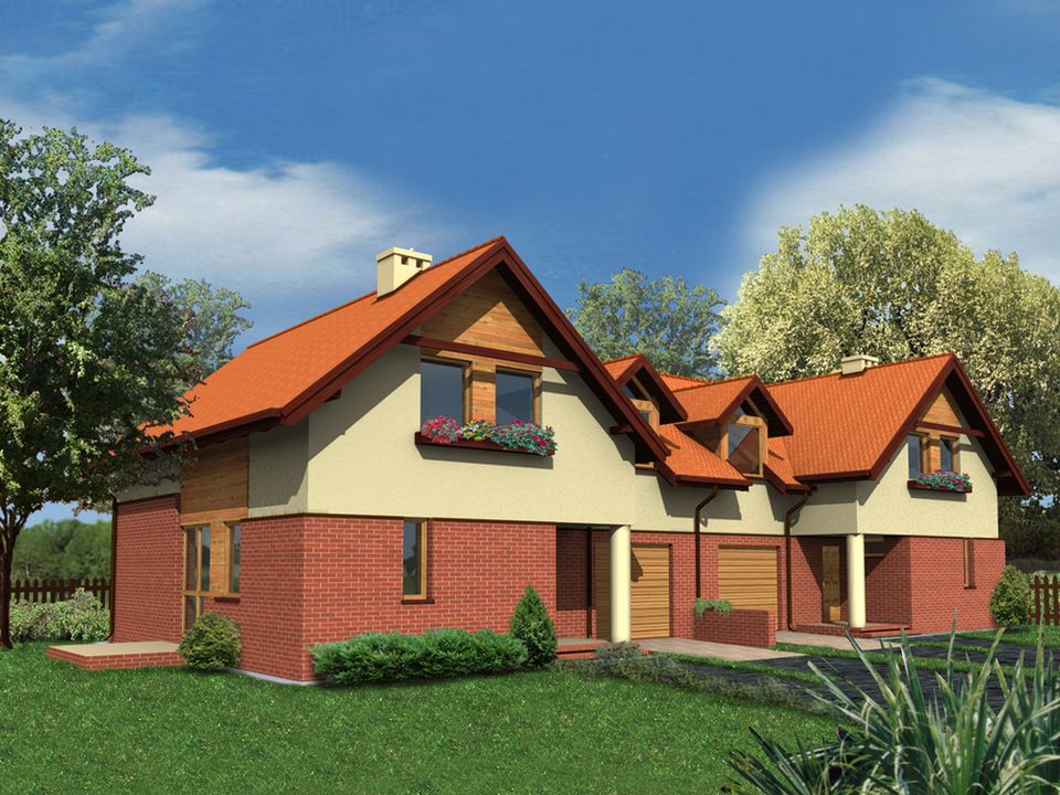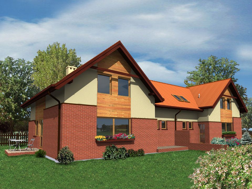 Projekt domu B04 Wymiary i powierzchnie podane są dla jednego segmentu gdyż cały bliźniak składa się z zestawionych ze sobą domów WM02 i WM02L. W projekcie W02 Orlik przeznaczonym dla cztero - lub pięcioosobowej rodziny wyraźnie oddzielono (na dwóch poziomach) cześć dzienną od części nocnej. Parter może być otwartym, jednoprzestrzennym wnętrzem, lub pozostać w układzie tradycyjnym (pokój dzienny i kuchnię rozdzieli ściana). Poddasze pełni funkcję sypialnianą. Konstrukcja domu (brak wewnętrznych ścian konstrukcyjnych) umożliwia inny od zaproponowanego, indywidualny podział wnętrza. Na poddaszu, o podziale pomieszczeń lekkimi ściankami działowymi można zadecydować praktycznie już po zbudowaniu dachu i wstawieniu okien, kierując się własnymi potrzebami i wymiarami posiadanych mebli. Kuchnia, łazienka na parterze i na piętrze usytuowane są wokół jednego komina i pionu instalacyjnego. Zmniejsza to koszty budowy i eksploatacji. Jest wygodnym mieszkaniem dla wieloosobowej rodziny. Projekt przewiduje kilka wariantów elewacji oraz wersję z podpiwniczeniem (wszystkie warianty znajdują się w dokumentacji) W wersji podstawowej dom ma elewację wykończoną białym tynkiem mineralnym, cokół oblicowany płytkami klinkierowymi oraz fragmenty ścian obłożone deskami. Dach pokryty jest dachówką ceramiczną, a okapy podbite deskami pomalowanymi w kolorze ciemnego brązu. Ściany są murowane z bloczków ceramicznych i betonowych i ocieplone płytami styropianu lub wełny mineralnej. Nad parterem zaprojektowano strop żelbetowy gęsto żebrowy wykonany z gotowych elementów belek i pustaków stropowych. Konstrukcja dachu jest krokwiowo-jętkowa z belkami, słupami i płatwiami z drewna sosnowego. Do budowy domu przewiduje się zastosowanie powszechnie dostępnych materiałów budowlanych, Dzienna część domu to salon i kuchnia, które można połączyć lub oddzielić ścianą. W kuchni od strony ulicy można również wydzielić małą spiżarnię. Kuchnia, łazienka na parterze i ta na piętrze usytuowane są wokół jednego komina i pionu instalacyjnego. Zmniejsza to koszty eksploatacji, zwłaszcza podczas korzystania z ciepłej wody, która cyrkuluje w bardzo krótkich odcinkach rur, więc nie trzeba czekać i marnować zimnej aż do rąk dopłynie ciepła. Konstrukcja budynku pozwala również na różnorodne urządzanie poddasza. Podział pomieszczeń wykonany lekkimi ściankami działowymi można wykonać inaczej i praktycznie budujący po zbudowaniu dachu i wstawieniu okien może sam zadecydować gdzie je postawi uwzględniając indywidualne potrzeby i wymiary posiadanych mebli. Często się bowiem zdarza, że kształt i wielkość domu zależy z jednej strony od wymagań dostosowania do charakteru architektury otoczenia, a z drugiej od wymiarów i sposobu ustawienia mebli. Projekt był opublikowany na łamach Dodatku do Dziennika Bałtyckiego i Wieczoru Wybrzerza w październiku 2001 roku. Komentarz autorski do projektu WM02 Dom przeznaczony jest dla pięcioosobowej rodziny i można go zbudować na niedużej działce o powierzchni 350 m2. Jego bryła składa się z dwu połączonych – przenikających się części, z których każda ma prosty dwuspadowy dach pokryty dachówką. Część domu ustawiona szczytem do ulicy ma wejście umieszczone w podcieniu podpartym grubym filarem. Znajduje się w niej zasadnicza część domu z kuchnią i salonem na parterze, a sypialniami i łazienką na poddaszu. Druga bryła domu ustawiona kalenicą równolegle do ulicy ma w przyziemiu garaż, nad którym zaprojektowano obszerną sypialnię państwa domu. W centralnej części domu, obok wejścia i widoczne z salonu są schody na piętro. Cztery sypialnie, garderoba i duża łazienka pozwolą na wygodne życie wielodzietnej rodziny, chociaż jeden z pokoi może pełnić rolę pokoju gościnnego. Niewielki gabarytowo dom wygląda na większy niż jest w rzeczywistości. Sprawia to jego dwubryłowa konstrukcja, dzięki której powstaje podcień wejściowy i taras ogrodowy z zaciszną wnęką za garażem. Różne koncepcje elewacji domu od wykończenia standardowego w białym tynku, aż po zastosowane cegły