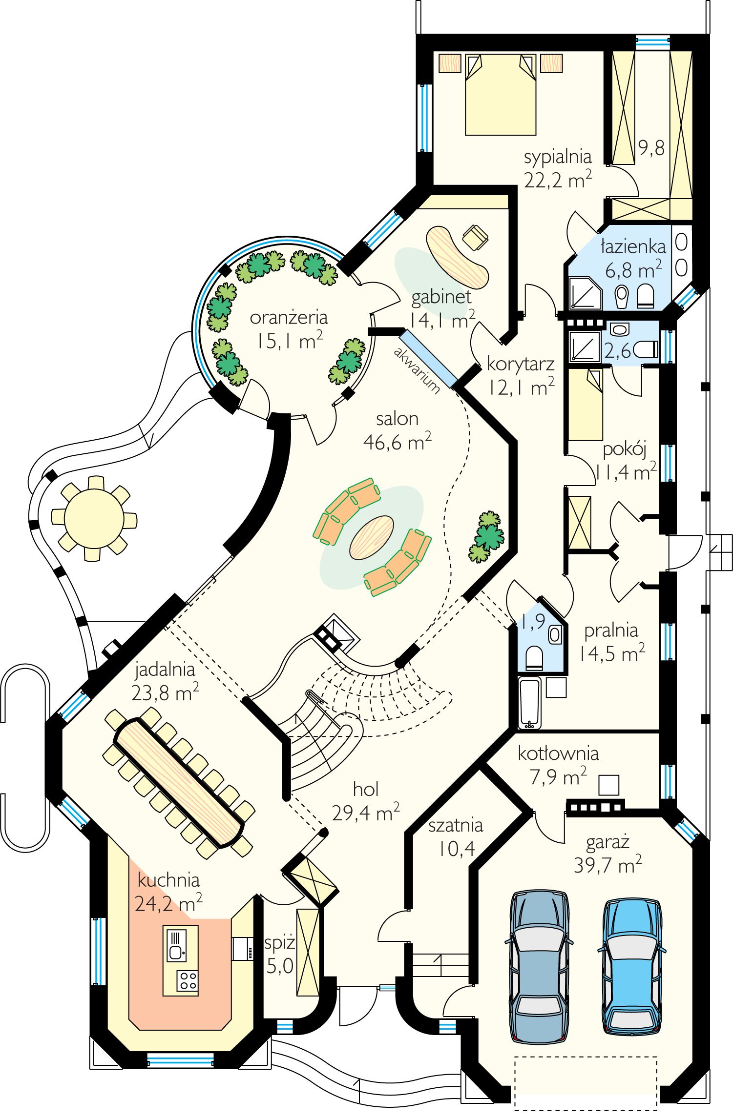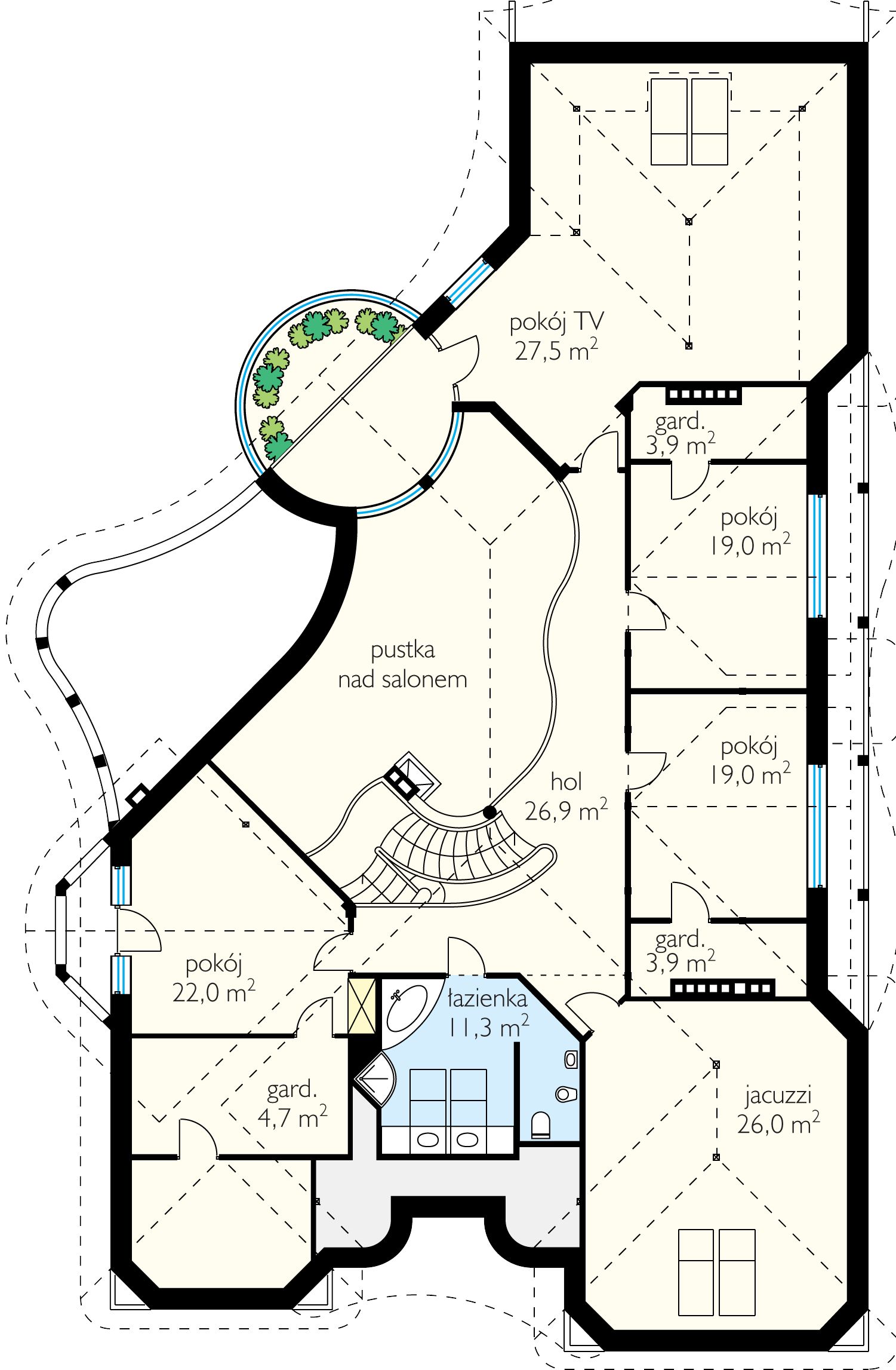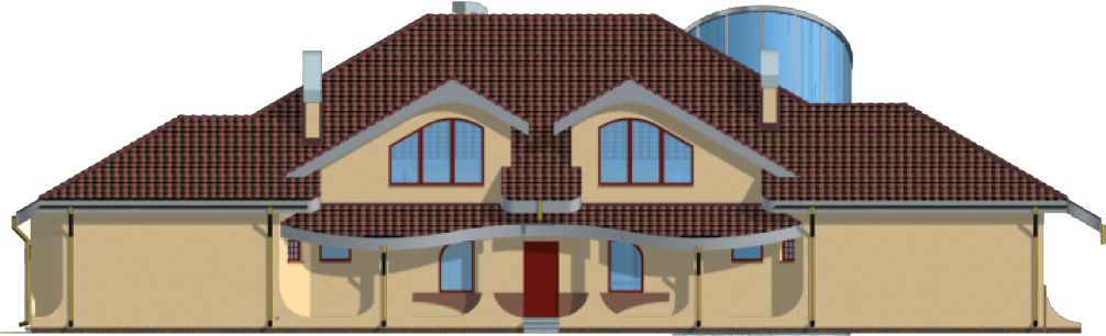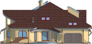 Graficzne opracowanie rzutów poglądowych widocznych na karcie projektu zostało wykonane przez Extradom.pl. Prezentowane przez Extradom.pl wizualizacje wykonane zostały przez autora projektu i należy poczytywać je jedynie za przykład i propozycję wykończenia, wizję architektoniczną autora projektu. Ostateczne wykończenie budynku może nastąpić na wiele sposobów. Szczegółowe rozwiązania zastosowane w oferowanej dokumentacji - w tym również ilość, lokalizacje i wygląd okien, drzwi, kominów - mogą w niewielkim stopniu różnić się od prezentowanej wizualizacji budynku.