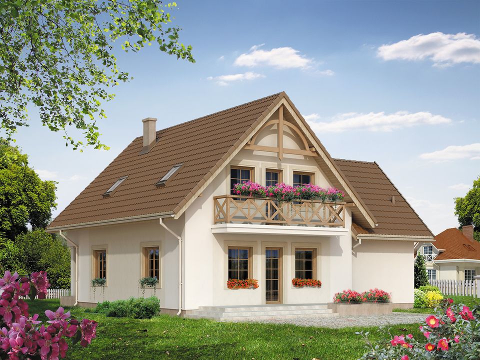 Ściany: 2-warstwowe - pustak ceramiczny + styropian. Stropy: żelbetowe, wylewane. Dach: dachówka ceramiczna, kąt nachylenia 45°. Ogrzewanie: gazowe, pakiet "Kotłownia na paliwo stałe", olejowe.