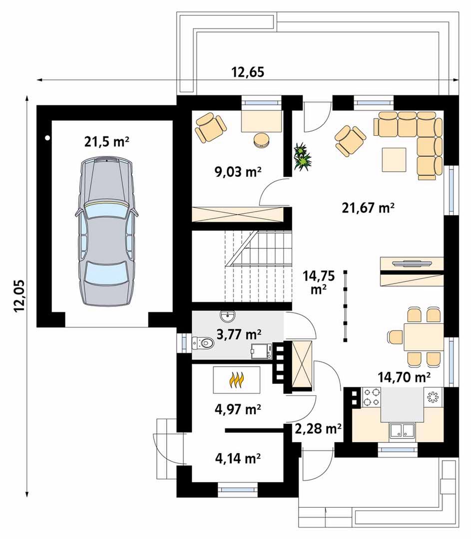 Graficzne opracowanie rzutów poglądowych widocznych na karcie projektu zostało wykonane przez Extradom.pl. Prezentowane przez Extradom.pl wizualizacje wykonane zostały przez autora projektu i należy poczytywać je jedynie za przykład i propozycję wykończenia, wizję architektoniczną autora projektu. Ostateczne wykończenie budynku może nastąpić na wiele sposobów. Szczegółowe rozwiązania zastosowane w oferowanej dokumentacji - w tym również ilość, lokalizacje i wygląd okien, drzwi, kominów - mogą w niewielkim stopniu różnić się od prezentowanej wizualizacji budynku.