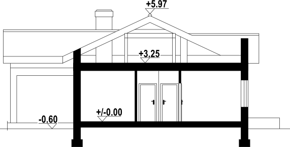 Wysokość ścianki kolankowej: 0.59 m. Strop: płyta żelbetowa. Pokrycie dachu: dachówka ceramiczna. Ściany zewnętrzne: pustaki ceramiczne + styropian. Ściany wewnętrzne: pustaki ceramiczne. Typ ogrzewania: kocioł na paliwo stałe.