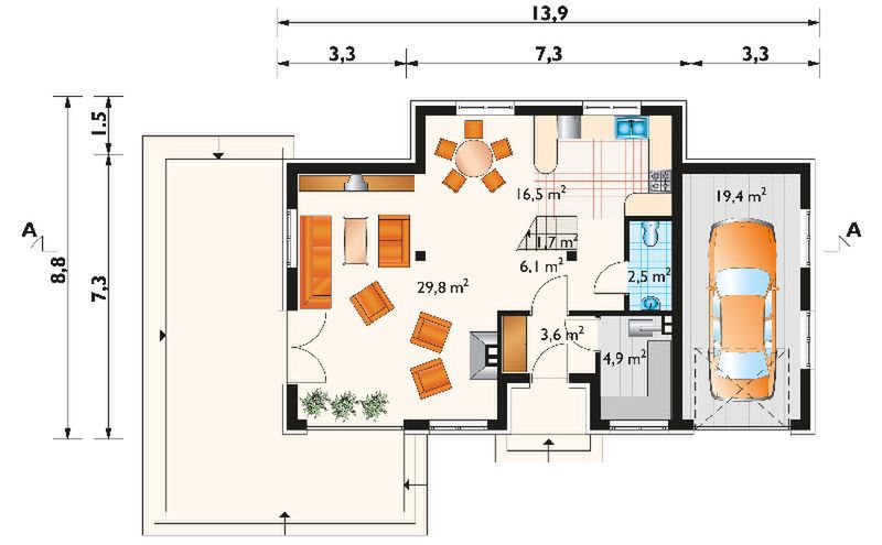 Technologia i konstrukcja: murowana – ceramika. Ściany zewnętrzne: cegła kratówka + styropian. Ściany wewnętrzne: cegła kratówka lub dziurawka. Strop: żelbetowy. Konstrukcja dachu: drewniana, jętkowa. Rodzaj schodów: żelbetowe. Typ ogrzewania: kocioł na gaz. Aneks na paliwo stałe: na zamówienie. Pokrycie dachu: dachówka cementowa lub blacha dachówkowa. Elewacja: tynk cienkowarstwowy, cegła klinkierowa.