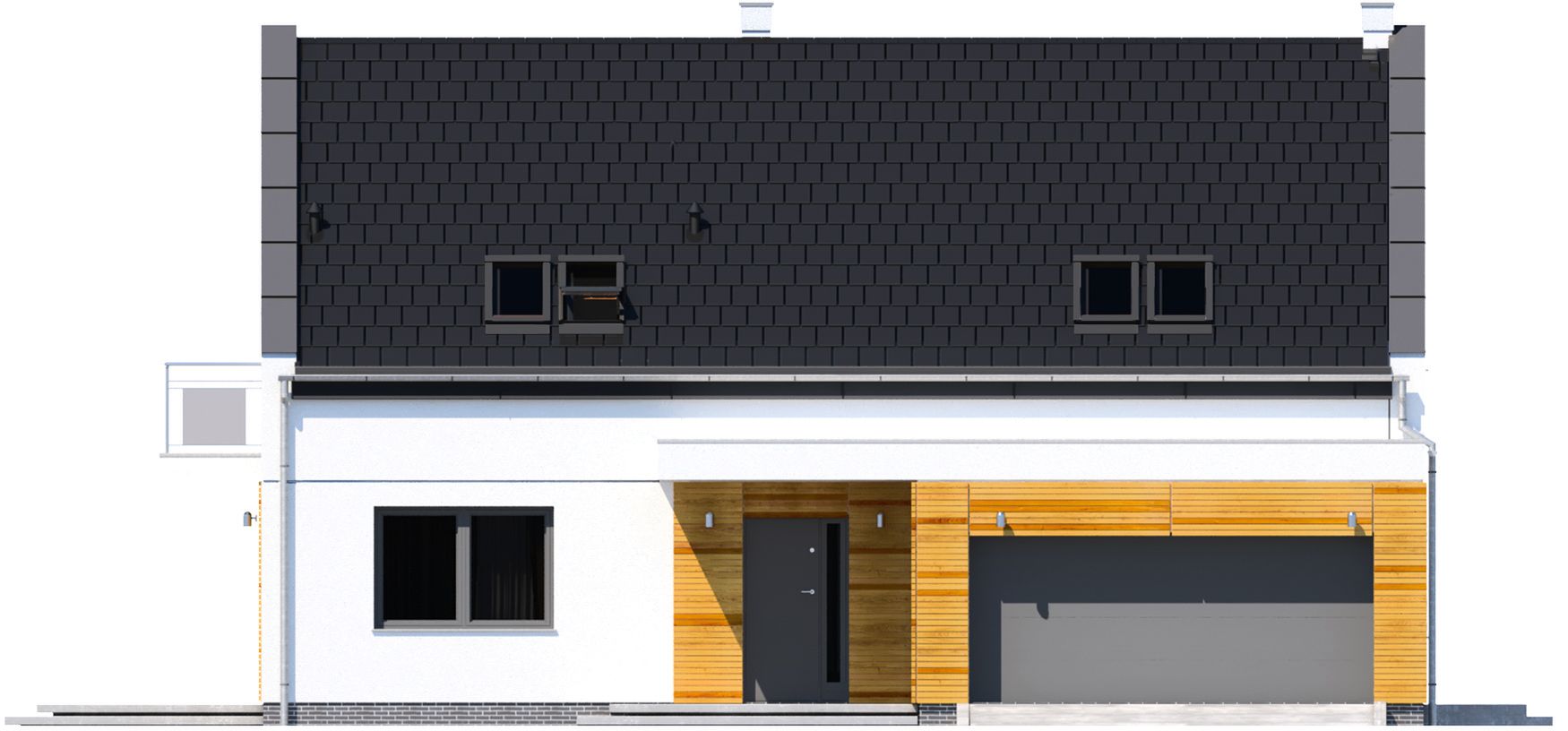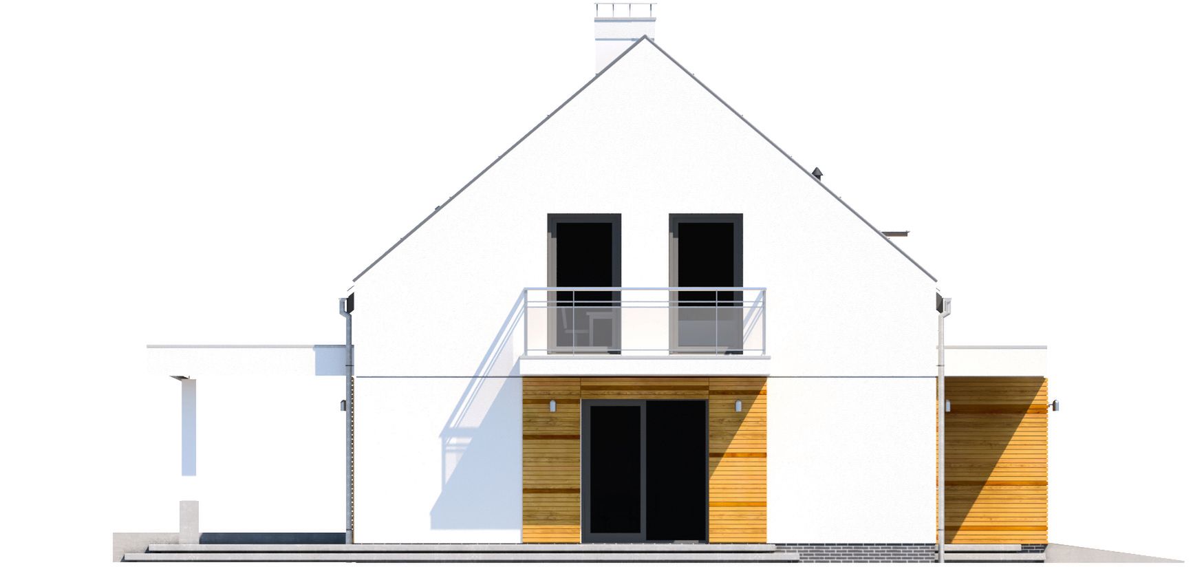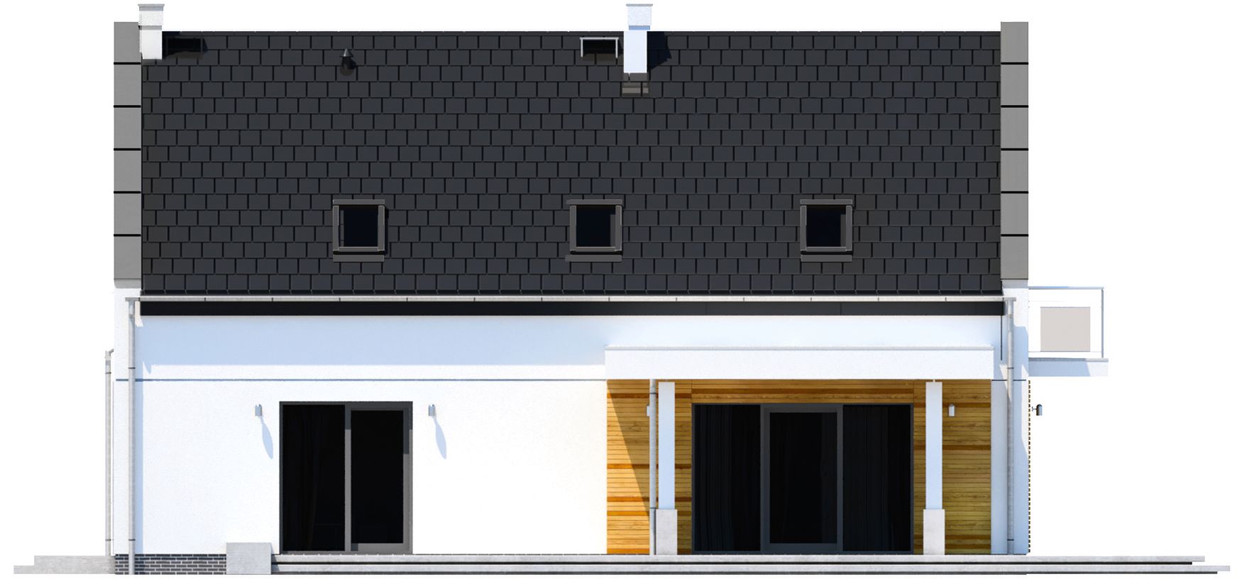 Graficzne opracowanie rzutów poglądowych widocznych na karcie projektu zostało wykonane przez Extradom.pl. Prezentowane przez Extradom.pl wizualizacje wykonane zostały przez autora projektu i należy poczytywać je jedynie za przykład i propozycję wykończenia, wizję architektoniczną autora projektu. Ostateczne wykończenie budynku może nastąpić na wiele sposobów. Szczegółowe rozwiązania zastosowane w oferowanej dokumentacji - w tym również ilość, lokalizacje i wygląd okien, drzwi, kominów - mogą w niewielkim stopniu różnić się od prezentowanej wizualizacji budynku.