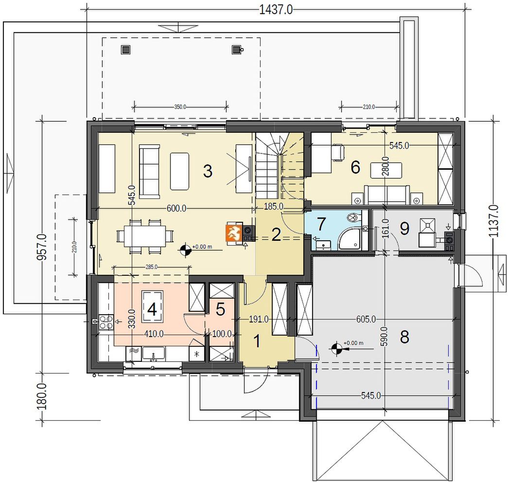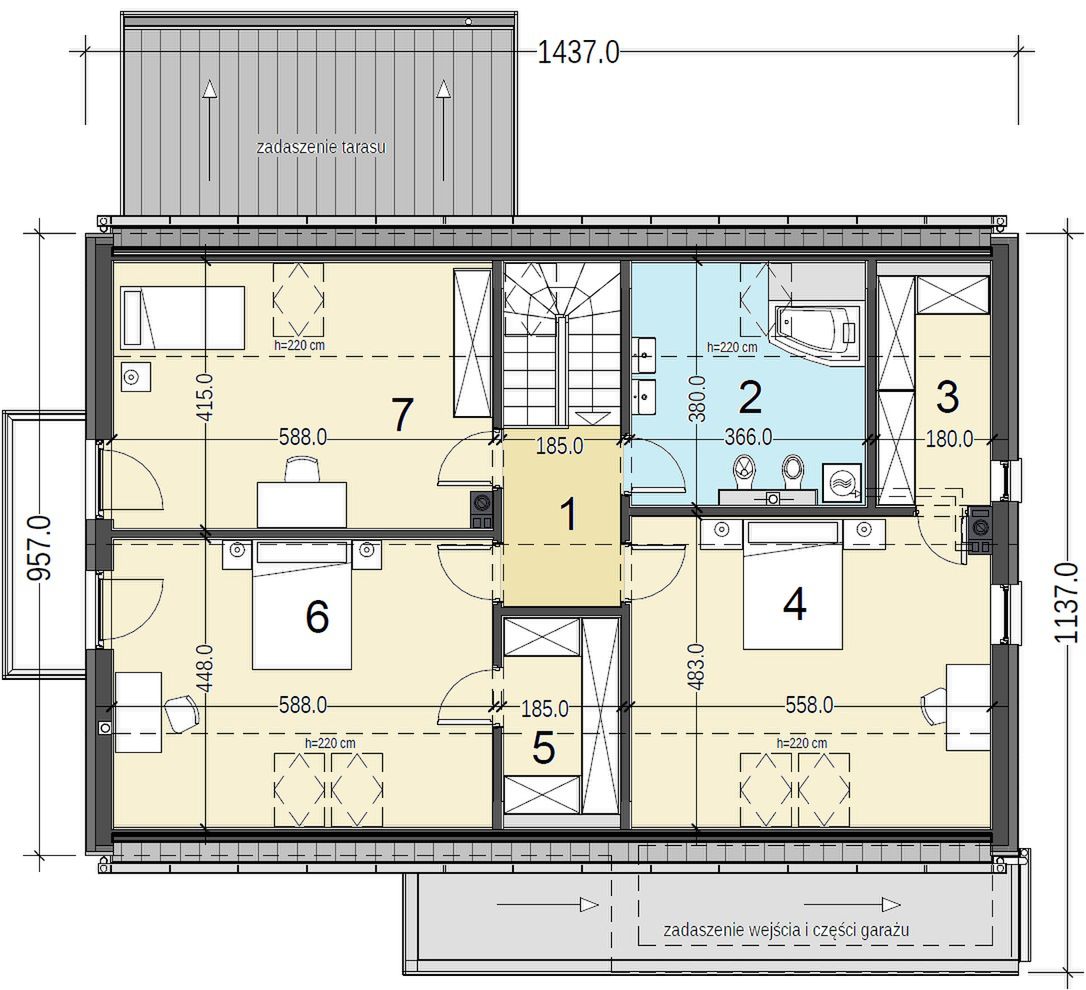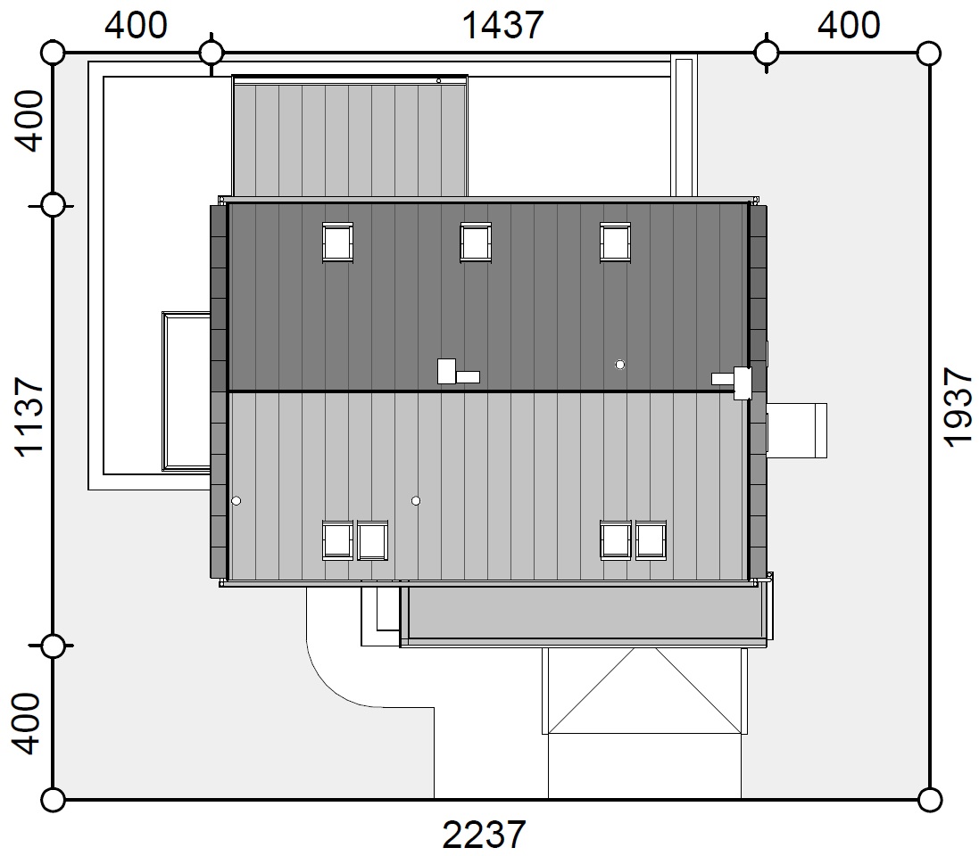 Graficzne opracowanie rzutów poglądowych widocznych na karcie projektu zostało wykonane przez Extradom.pl. Prezentowane przez Extradom.pl wizualizacje wykonane zostały przez autora projektu i należy poczytywać je jedynie za przykład i propozycję wykończenia, wizję architektoniczną autora projektu. Ostateczne wykończenie budynku może nastąpić na wiele sposobów. Szczegółowe rozwiązania zastosowane w oferowanej dokumentacji - w tym również ilość, lokalizacje i wygląd okien, drzwi, kominów - mogą w niewielkim stopniu różnić się od prezentowanej wizualizacji budynku.