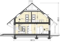 Posadowienie bezpośrednie na zbrojonych ławach i stopach fundamentowych wykonanych z betonu B 20. Ściany fundamentowe: murowane z bloczków betonowych M6. Ściany zewnętrzne: bloczki gazobetonowe gr. 25cm na zaprawie systemowej, ciepłochronnej, ocieplony styropianem fasadowym gr. 15cm. Do ocieplenia budynku zaprojektowano użycie styropianu grafitowego gr. 15 cm, o współczynniku „lambda” nie przekraczającym 0,035 W(mK) i „oporze cieplnym” nie mniejszym niż Rd – 4,0 m2k/W. Zastosowanie materiałów budowlanych (ocieplenie ścian, dachu, podłogi na gruncie, okien i drzwi zewnętrznych) użytych w projekcie odpowiada nowym wymaganiom obowiązującym od stycznia 2021 roku (WT2021). Ściany nośne wewnętrzne: bloczki gazobetonowe gr. 25cm na zaprawie cementowo-wapiennej lub systemowej. Ściany wewnętrzne działowe: bloczki gazobetonowe gr. 12cm. Strop gęstożebrowy z wypełnieniem pustakami betonowymi, zalewany wraz z wieńcami betonem B 20. Konstrukcja dachu: drewniana, drewno klasy C24, więźba dachowa krokwiowo-jętkowa. Budynek, w wersji podstawowej, jest zaprojektowany z pomieszczeniem kotłowni wyposażonej w kocioł ekologiczny na paliwo stałe „pellet” i spełnia wszystkie wymagania dotyczące WT2021. Na etapie adaptacji projektu jest możliwość zaprojektowania ogrzewania gazowego ze wspomaganiem instalacją solarną lub ogrzewania nowoczesną pompa ciepła typu powietrze – woda. Projekt pod względem konstrukcyjnym spełnia normy zgodne z Eurokodami.