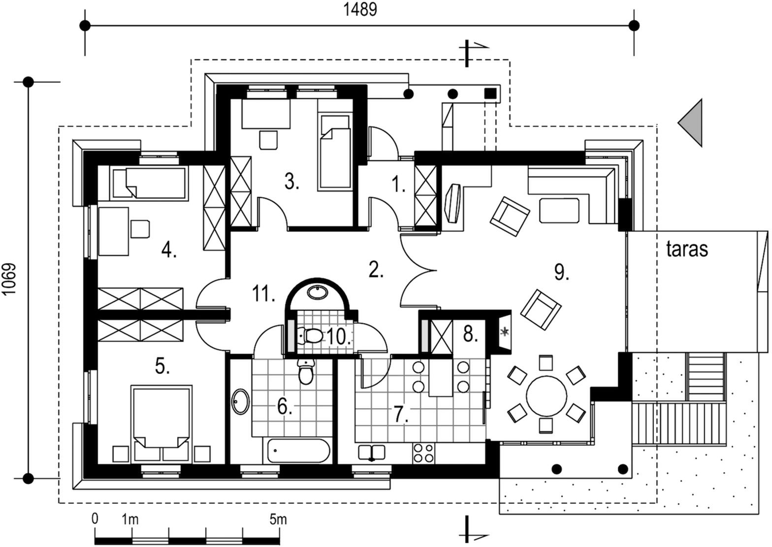 Ściany zewnętrzne dwuwarstwowe: cegła SILKA + wełna mineralna + tynk. Ściany wewnętrzne: cegła SILKA i/lub płyty na ruszcie stalowym, wygłuszone wełną mineralną. Strop: drewniany. Więźba dachowa: tradycyjna drewniana. Poszycie dachu: dachówka cementowa. Stolarka: drewniana lub PCV. Instalacja centralnego ogrzewania: kocioł dwufunkcyjny + grzejniki.