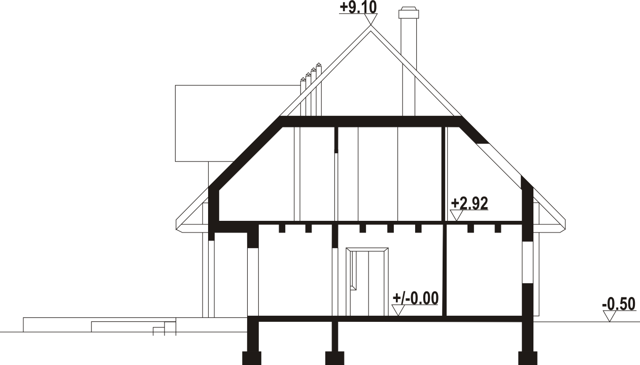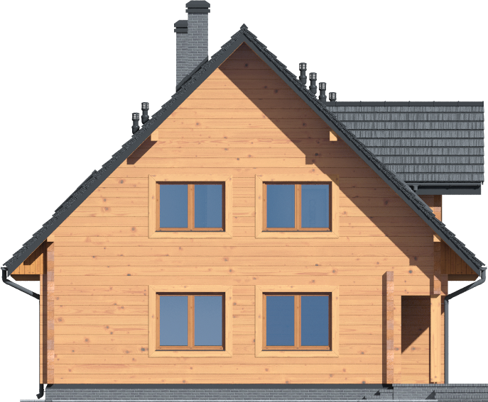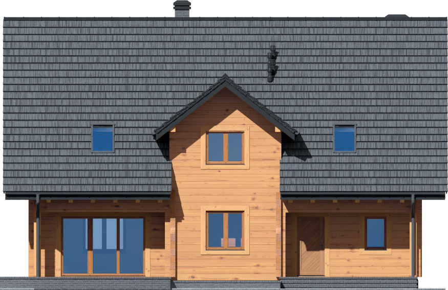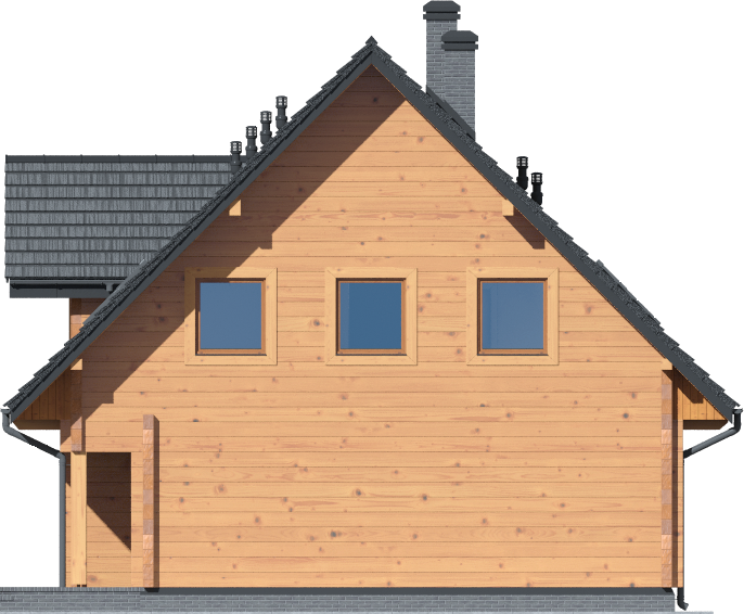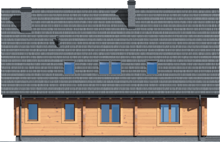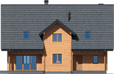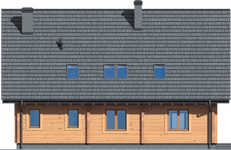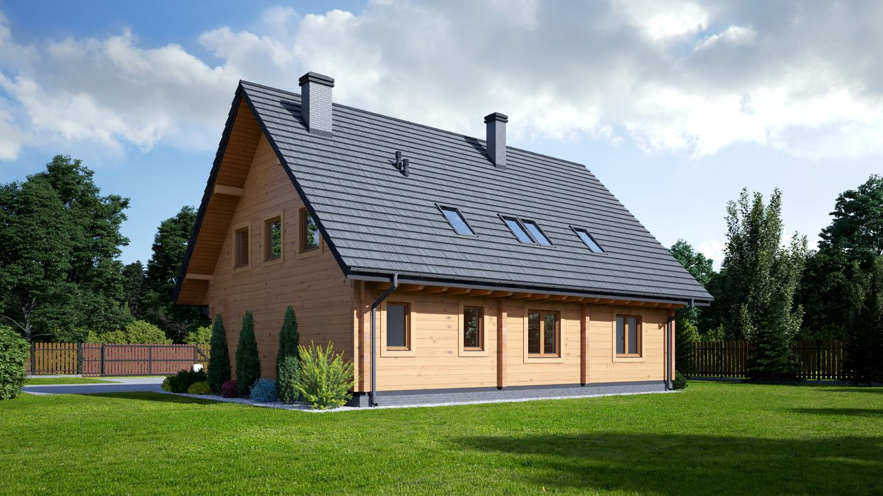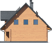Wysokość ścianki kolankowej: 0.93 m. Strop: drewniany. Pokrycie dachu: dachówka gontopodobna Gerard Corona. Ściany zewnętrzne: płazy drewniane + wełna mineralna + deska. Ściany wewnętrzne: płazy drewniane. Typ ogrzewania: kocioł gazowy lub kocioł na paliwo stałe. Instalacje dodatkowe: instalacja solarna. Inne: okna połaciowe Velux.