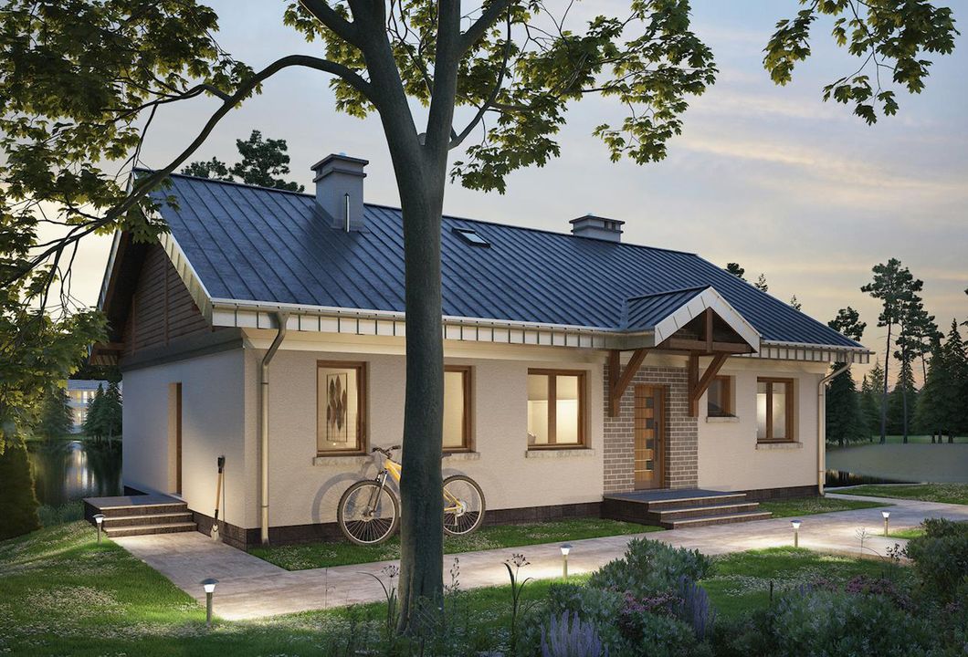 Graficzne opracowanie rzutów poglądowych widocznych na karcie projektu zostało wykonane przez Extradom.pl. Prezentowane przez Extradom.pl wizualizacje wykonane zostały przez autora projektu i należy poczytywać je jedynie za przykład i propozycję wykończenia, wizję architektoniczną autora projektu. Ostateczne wykończenie budynku może nastąpić na wiele sposobów. Szczegółowe rozwiązania zastosowane w oferowanej dokumentacji - w tym również ilość, lokalizacje i wygląd okien, drzwi, kominów - mogą w niewielkim stopniu różnić się od prezentowanej wizualizacji budynku.