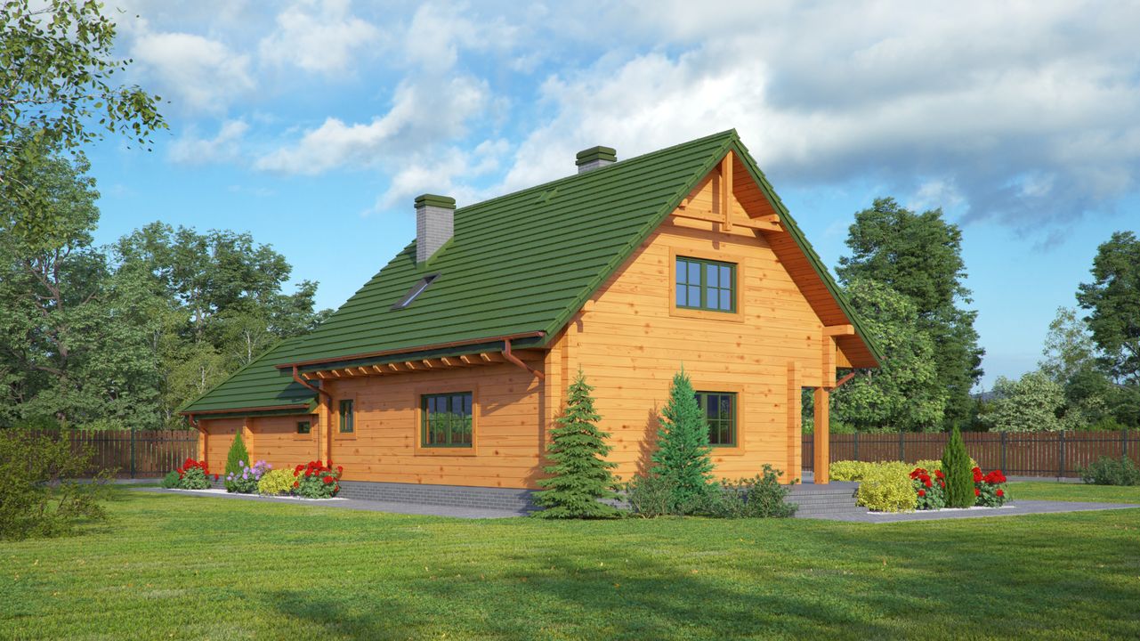 Wysokość ścianki kolankowej: 0.9 m. Strop: drewniany. Pokrycie dachu: dachówka ceramiczna. Ściany zewnętrzne: płazy drewniane + wełna mineralna + deska. Ściany wewnętrzne: płazy drewniane. Typ ogrzewania: kocioł gazowy.