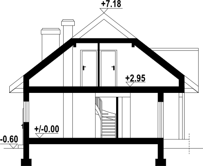 Wysokość ścianki kolankowej: 0.4 m. Strop: drewniany. Pokrycie dachu: blacho-dachówka. Ściany zewnętrzne: szkieletowe drewniane ocieplone wełną mineralną. Ściany wewnętrzne: szkieletowe drewniane. Typ ogrzewania: kocioł na paliwo stałe.