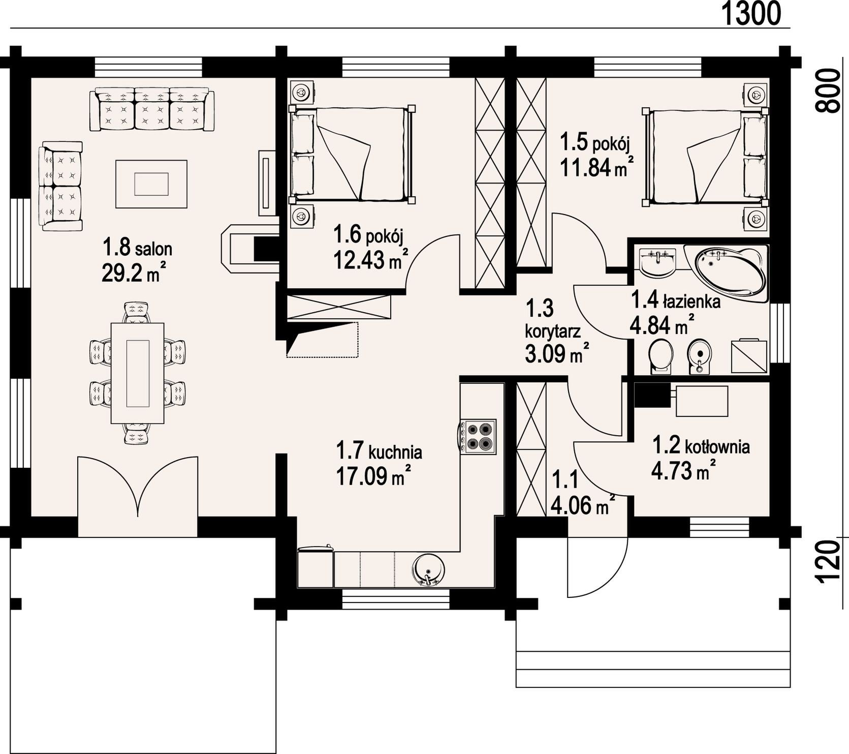 Informacje szczegółowe Powierzchnia dachu: 176.12 m² Ilość drewna na więźbę: 6.09 m³. Strop: drewniany. Pokrycie dachu: dachówka gontopodobna z posypka Gerard Corona. Ściany zewnętrzne: płazy drewniane + wełna mineralna + deska. Ściany wewnętrzne: płazy drewniane. Typ ogrzewania: kocioł gazowy lub kocioł na paliwo stałe.