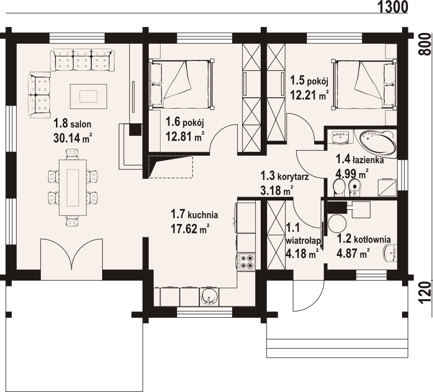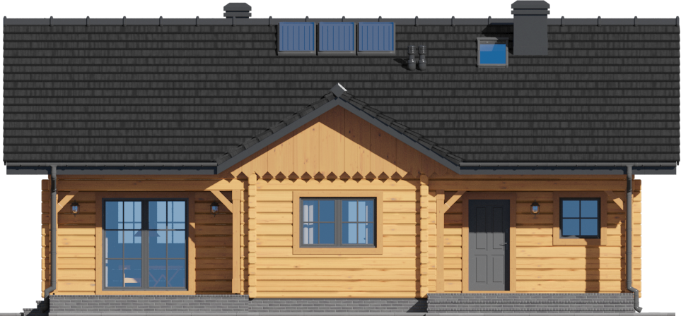 Graficzne opracowanie rzutów poglądowych widocznych na karcie projektu zostało wykonane przez Extradom.pl. Prezentowane przez Extradom.pl wizualizacje wykonane zostały przez autora projektu i należy poczytywać je jedynie za przykład i propozycję wykończenia, wizję architektoniczną autora projektu. Ostateczne wykończenie budynku może nastąpić na wiele sposobów. Szczegółowe rozwiązania zastosowane w oferowanej dokumentacji - w tym również ilość, lokalizacje i wygląd okien, drzwi, kominów - mogą w niewielkim stopniu różnić się od prezentowanej wizualizacji budynku.