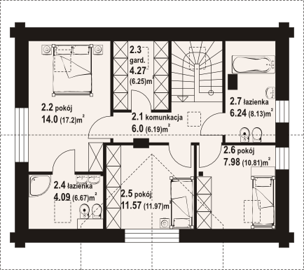 Wysokość ścianki kolankowej: 1.06 m. Strop: drewniany. Pokrycie dachu: dachówka gontopodobna Gerard Corona. Ściany zewnętrzne: płazy drewniane + wełna mineralna + deska. Ściany wewnętrzne: płazy drewniane. Typ ogrzewania: kocioł gazowy. Inne: okna połaciowe Fakro.
