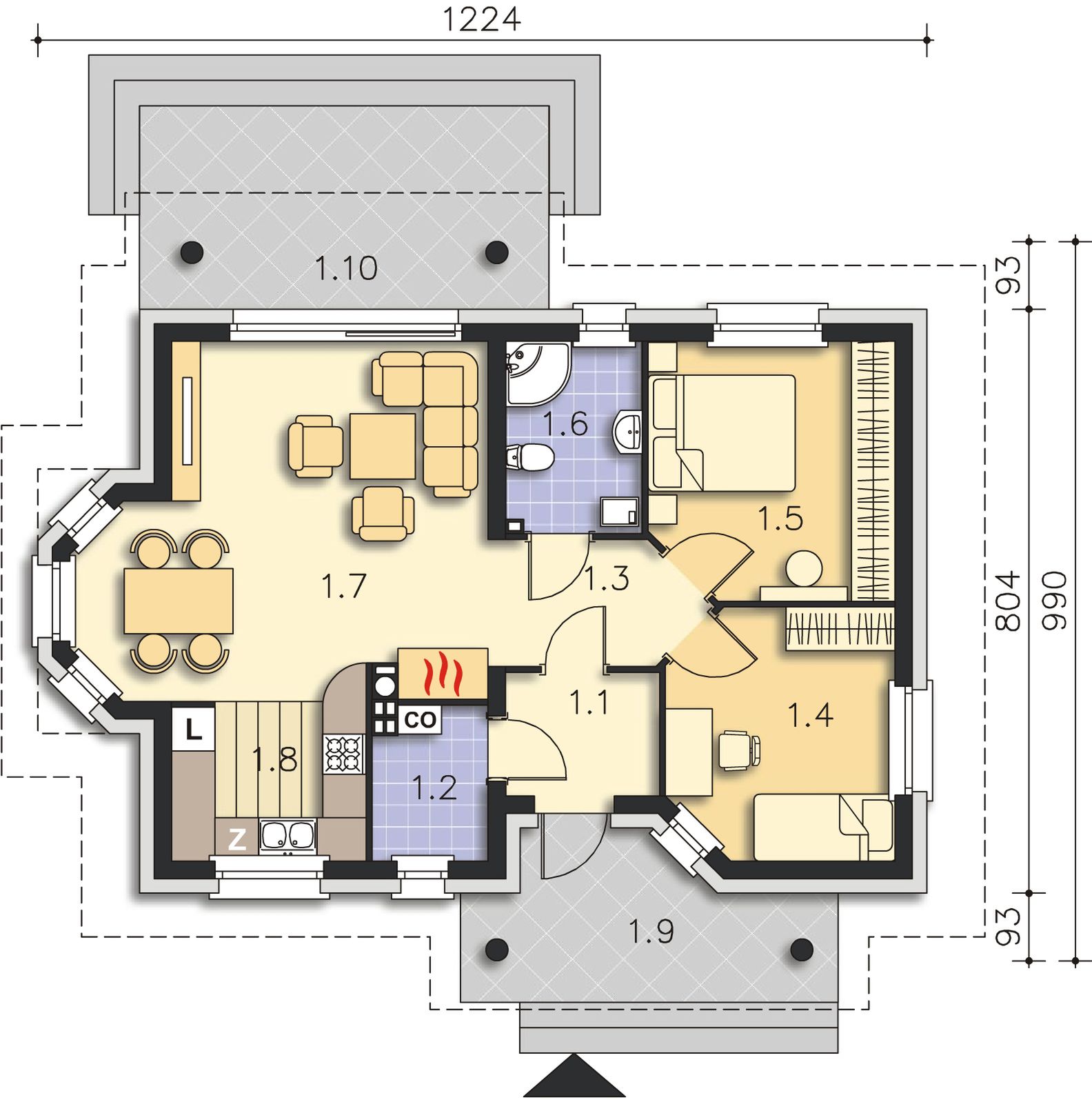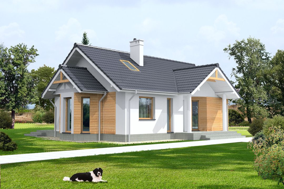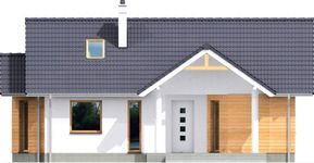 Graficzne opracowanie rzutów poglądowych widocznych na karcie projektu zostało wykonane przez Extradom.pl. Prezentowane przez Extradom.pl wizualizacje wykonane zostały przez autora projektu i należy poczytywać je jedynie za przykład i propozycję wykończenia, wizję architektoniczną autora projektu. Ostateczne wykończenie budynku może nastąpić na wiele sposobów. Szczegółowe rozwiązania zastosowane w oferowanej dokumentacji - w tym również ilość, lokalizacje i wygląd okien, drzwi, kominów - mogą w niewielkim stopniu różnić się od prezentowanej wizualizacji budynku.
