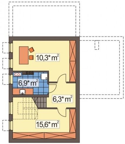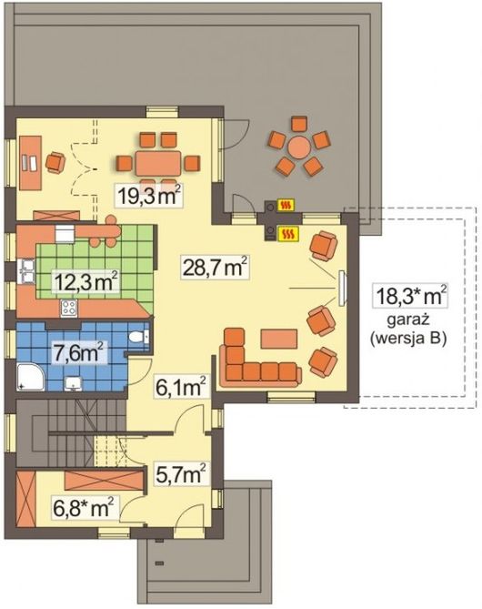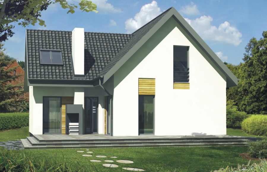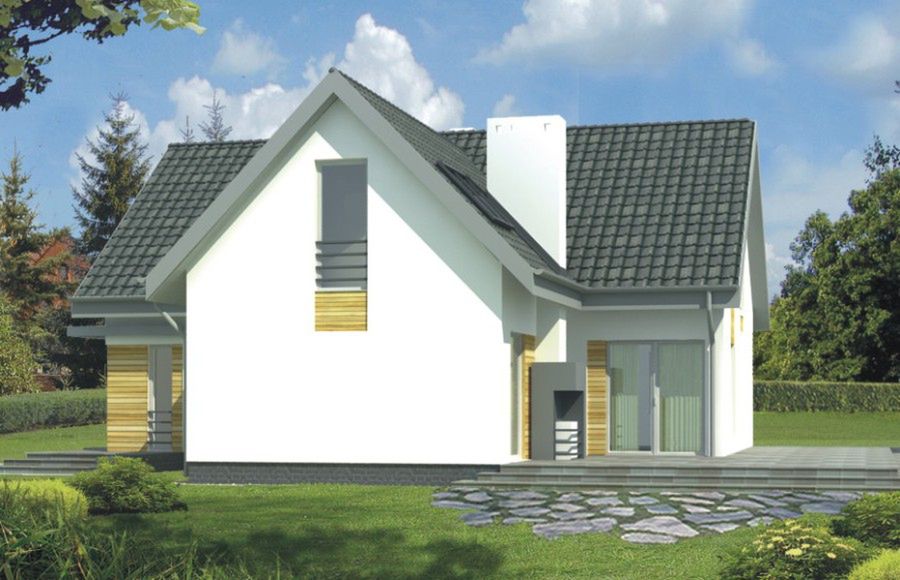 Graficzne opracowanie rzutów poglądowych widocznych na karcie projektu zostało wykonane przez Extradom.pl. Prezentowane przez Extradom.pl wizualizacje wykonane zostały przez autora projektu i należy poczytywać je jedynie za przykład i propozycję wykończenia, wizję architektoniczną autora projektu. Ostateczne wykończenie budynku może nastąpić na wiele sposobów. Szczegółowe rozwiązania zastosowane w oferowanej dokumentacji - w tym również ilość, lokalizacje i wygląd okien, drzwi, kominów - mogą w niewielkim stopniu różnić się od prezentowanej wizualizacji budynku.