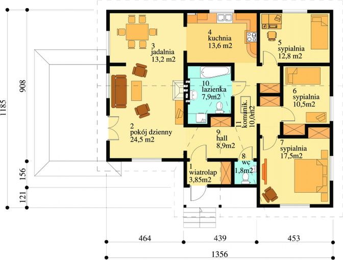 Graficzne opracowanie rzutów poglądowych widocznych na karcie projektu zostało wykonane przez Extradom.pl. Prezentowane przez Extradom.pl wizualizacje wykonane zostały przez autora projektu i należy poczytywać je jedynie za przykład i propozycję wykończenia, wizję architektoniczną autora projektu. Ostateczne wykończenie budynku może nastąpić na wiele sposobów. Szczegółowe rozwiązania zastosowane w oferowanej dokumentacji - w tym również ilość, lokalizacje i wygląd okien, drzwi, kominów - mogą w niewielkim stopniu różnić się od prezentowanej wizualizacji budynku.