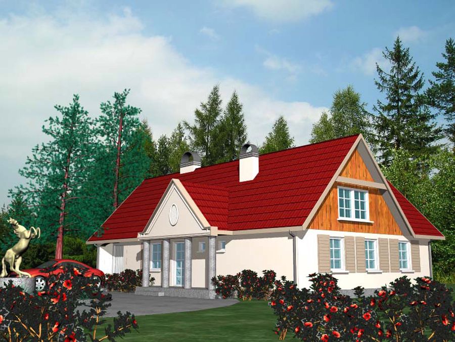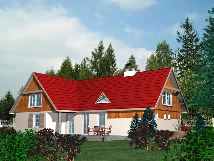 Graficzne opracowanie rzutów poglądowych widocznych na karcie projektu zostało wykonane przez Extradom.pl. Prezentowane przez Extradom.pl wizualizacje wykonane zostały przez autora projektu i należy poczytywać je jedynie za przykład i propozycję wykończenia, wizję architektoniczną autora projektu. Ostateczne wykończenie budynku może nastąpić na wiele sposobów. Szczegółowe rozwiązania zastosowane w oferowanej dokumentacji - w tym również ilość, lokalizacje i wygląd okien, drzwi, kominów - mogą w niewielkim stopniu różnić się od prezentowanej wizualizacji budynku.