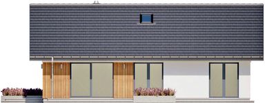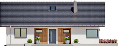 Graficzne opracowanie rzutów poglądowych widocznych na karcie projektu zostało wykonane przez Extradom.pl. Prezentowane przez Extradom.pl wizualizacje wykonane zostały przez autora projektu i należy poczytywać je jedynie za przykład i propozycję wykończenia, wizję architektoniczną autora projektu. Ostateczne wykończenie budynku może nastąpić na wiele sposobów. Szczegółowe rozwiązania zastosowane w oferowanej dokumentacji - w tym również ilość, lokalizacje i wygląd okien, drzwi, kominów - mogą w niewielkim stopniu różnić się od prezentowanej wizualizacji budynku.