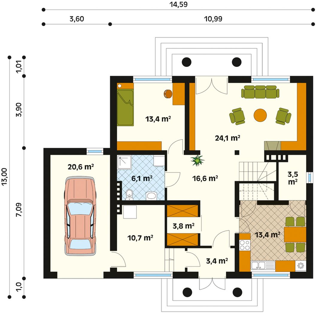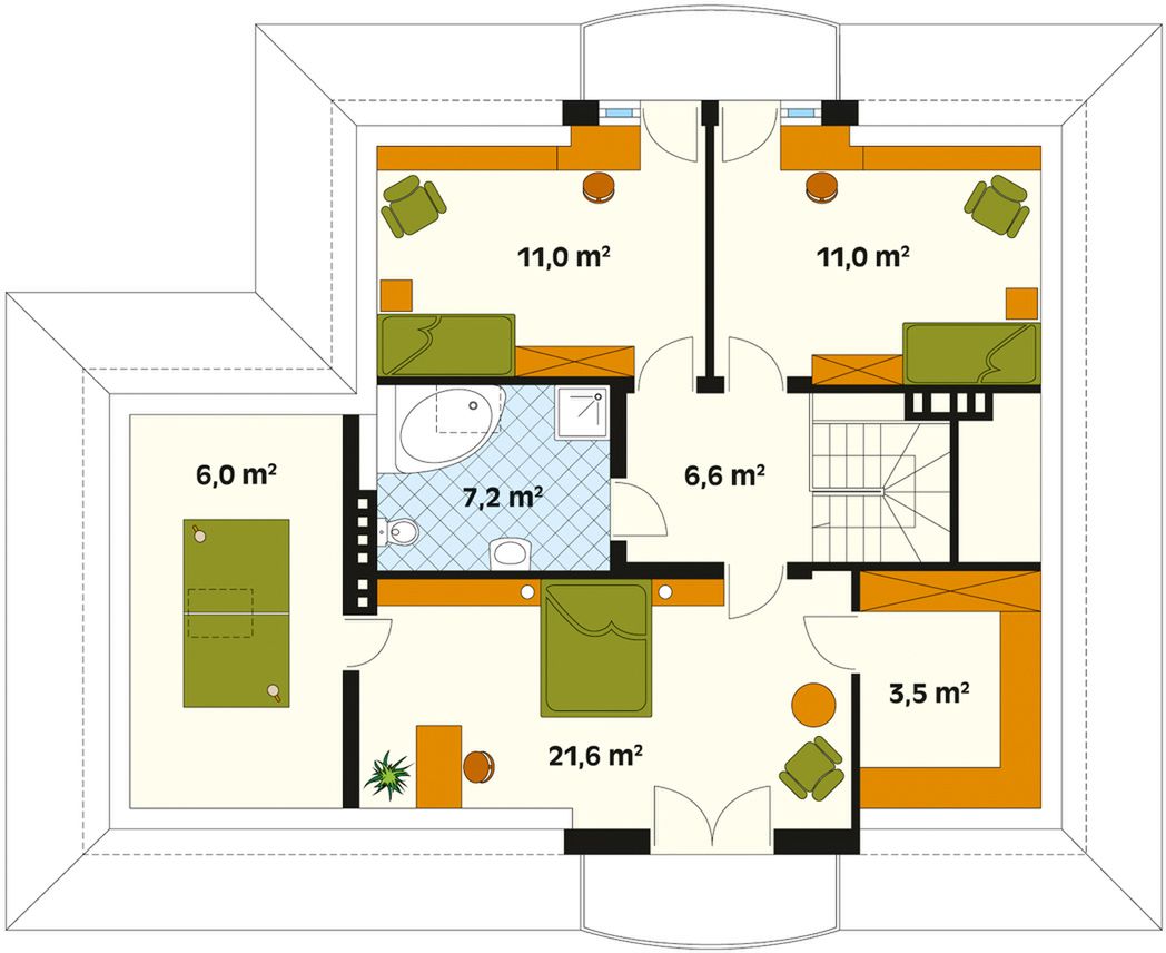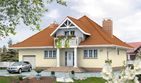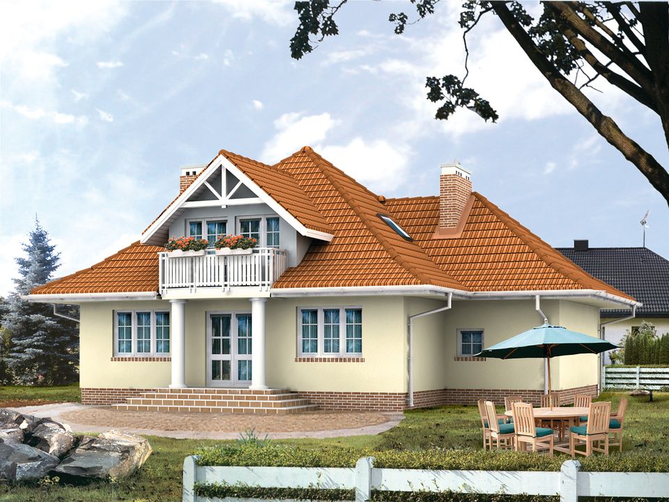 Graficzne opracowanie rzutów poglądowych widocznych na karcie projektu zostało wykonane przez Extradom.pl. Prezentowane przez Extradom.pl wizualizacje wykonane zostały przez autora projektu i należy poczytywać je jedynie za przykład i propozycję wykończenia, wizję architektoniczną autora projektu. Ostateczne wykończenie budynku może nastąpić na wiele sposobów. Szczegółowe rozwiązania zastosowane w oferowanej dokumentacji - w tym również ilość, lokalizacje i wygląd okien, drzwi, kominów - mogą w niewielkim stopniu różnić się od prezentowanej wizualizacji budynku.