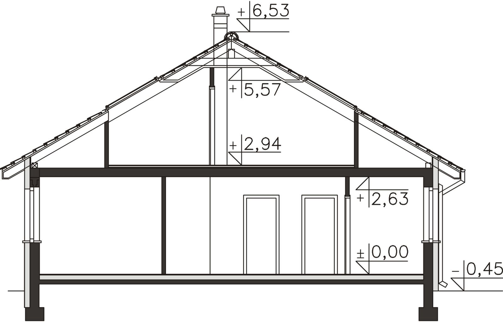 Fundamenty - rozwiązanie o podwyższonej izolacji termicznej. Ściany zewnętrzne - Pustak ceramiczny 25 cm + styropian 15 cm. Strop - gęstożebrowy. Dach - tradycyjna więźba ciesielska. Ogrzewanie - c.o. grzejnikowe + c.w.u. - kocioł gazowy. Wentylacja - grawitacyjna.
