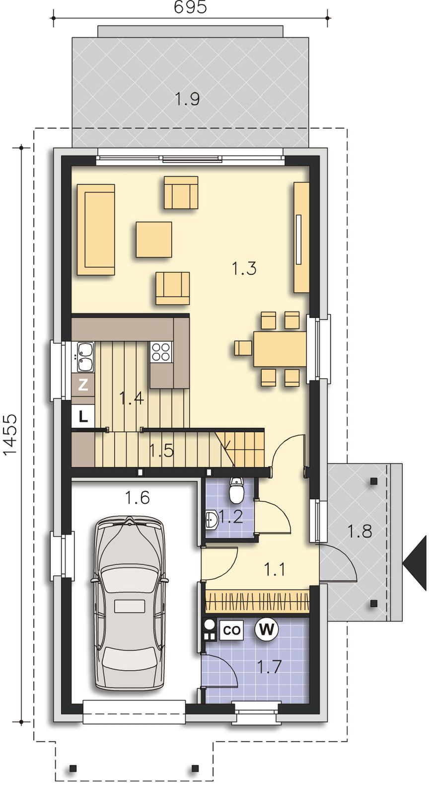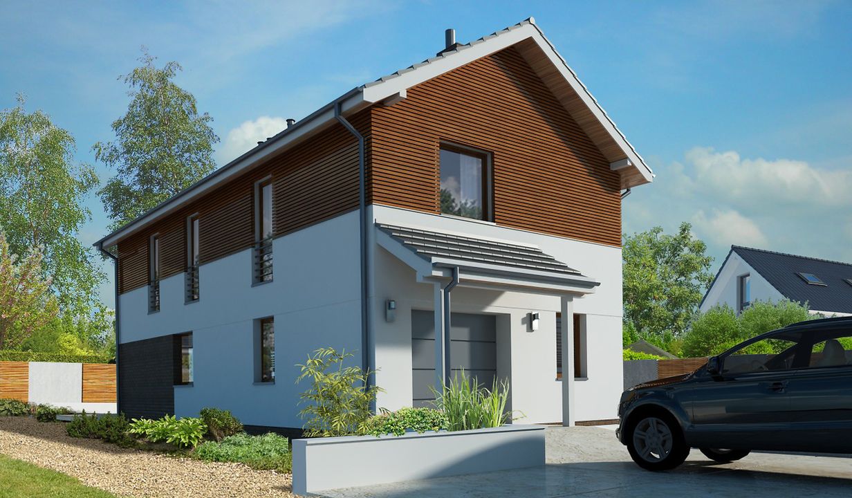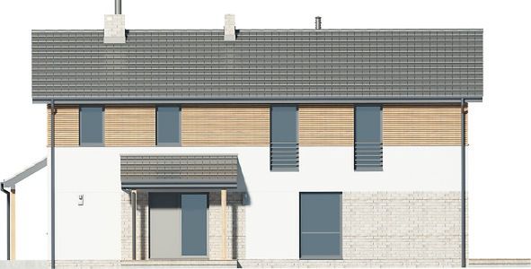 Graficzne opracowanie rzutów poglądowych widocznych na karcie projektu zostało wykonane przez Extradom.pl. Prezentowane przez Extradom.pl wizualizacje wykonane zostały przez autora projektu i należy poczytywać je jedynie za przykład i propozycję wykończenia, wizję architektoniczną autora projektu. Ostateczne wykończenie budynku może nastąpić na wiele sposobów. Szczegółowe rozwiązania zastosowane w oferowanej dokumentacji - w tym również ilość, lokalizacje i wygląd okien, drzwi, kominów - mogą w niewielkim stopniu różnić się od prezentowanej wizualizacji budynku.