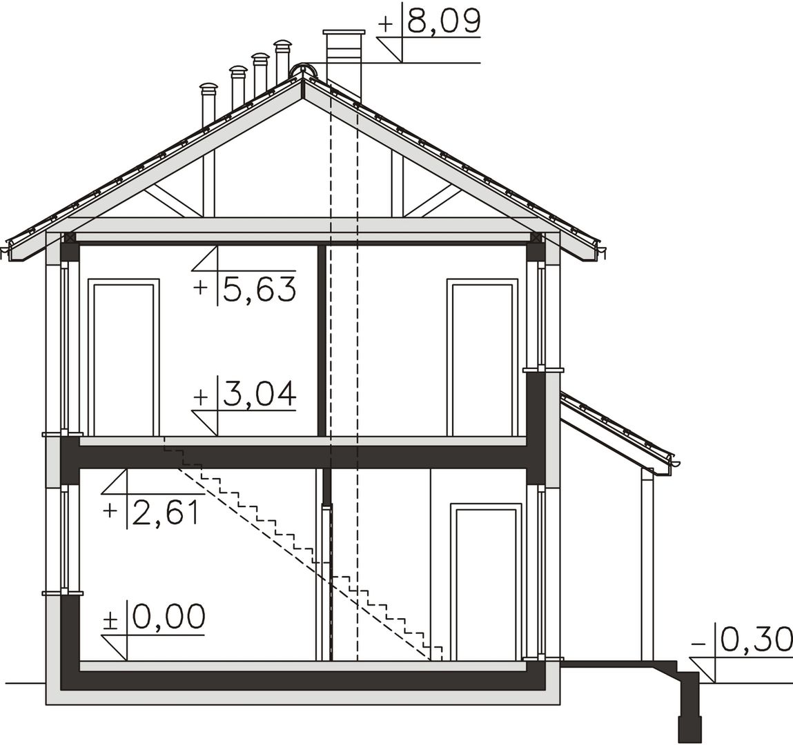 Fundamenty - płyta fundamentowa. Ściany zewnętrzne - Pustak ceramiczny 25 cm + styropian 20 cm. Strop - gęstożebrowy. Dach - wiązary prefabrykowane. Ogrzewanie - c.o. grzejnikowe + c.w.u. - kocioł gazowy (alternatywa paliwo stałe). Wentylacja - grawitacyjna.