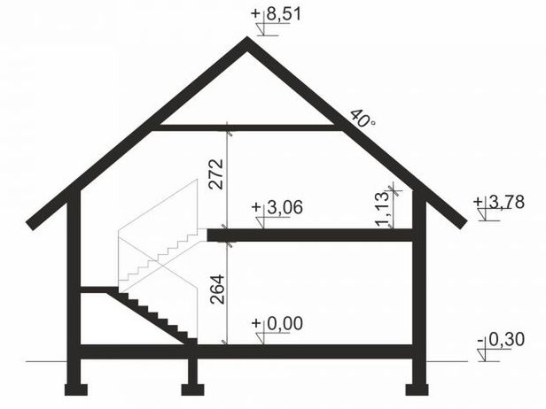 Fundamenty: bezpośrednie, na ławach fundamentowych. Ściany zewnętrzne: bloczki wapienno-piaskowe - 24 cm + styropian TERMO ORGANIKA typ Fasada 22 cm. Ściany wewnętrzne: bloczki wapienno-piaskowe - 24 cm (działowe – bloczki wapienno-piaskowe - 8 cm + ściany z płyty G-K na ruszcie (poddasze)). Strop: gęstożebrowy Teriva E oraz żelbetowy monolityczny gr. 24 i 18 cm. Elewacje: tynk - systemowy firmy TERMO ORGANIKA, okładzina z płytek elastycznych. Pokrycie dachu: blachodachówka lub dachówka cementowa. Konstrukcja dachu: tradycyjna drewniana. Schody wewnętrzne: drewniane. Ogrzewanie: kocioł gazowy kondensacyjny, dodatkowe źródło ciepła - kominek z płaszczem wodnym. Projekt jest zgodny z wymaganiami WT2021, a konstrukcja była obliczana zgodnie z eurokodami.