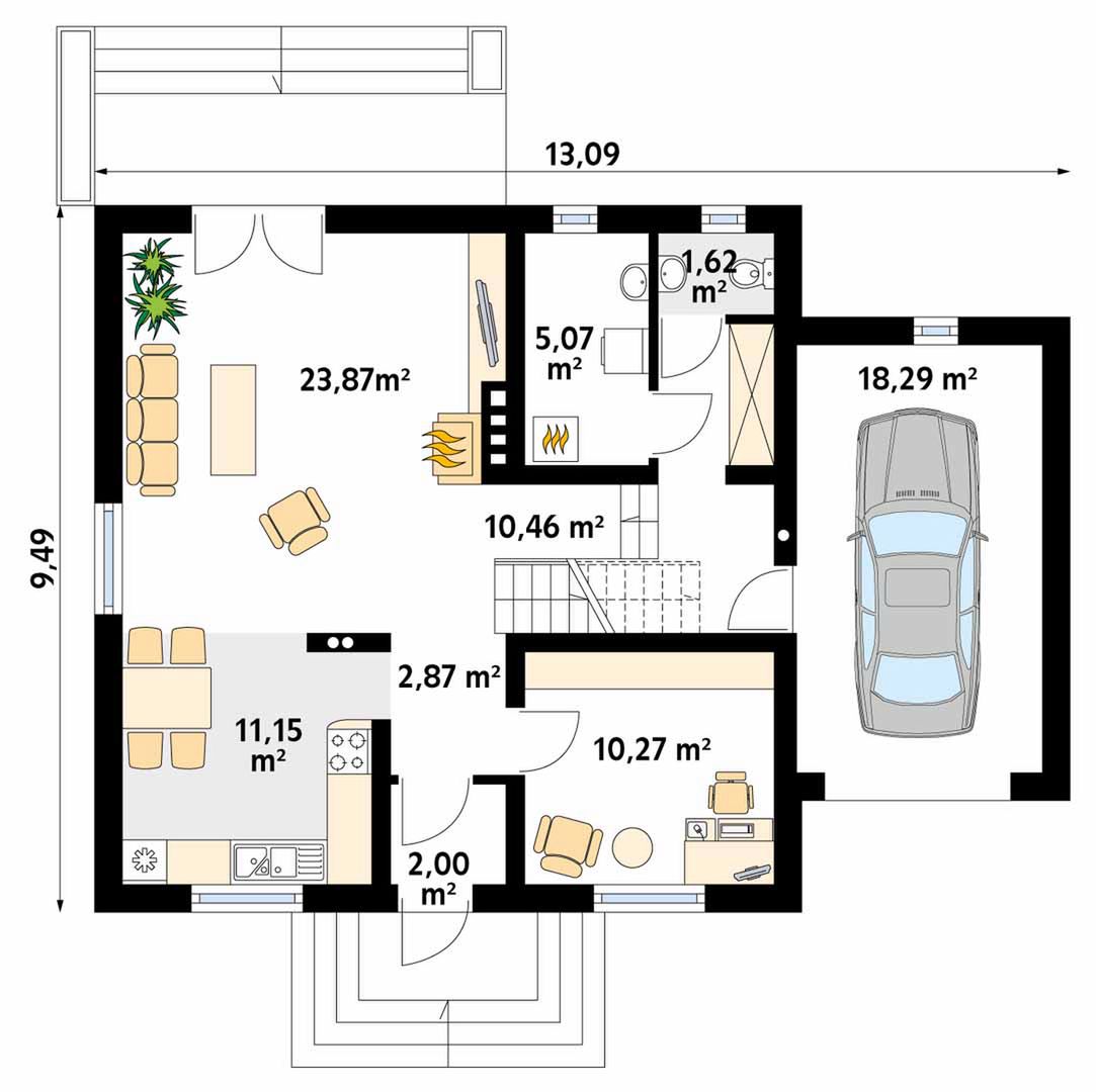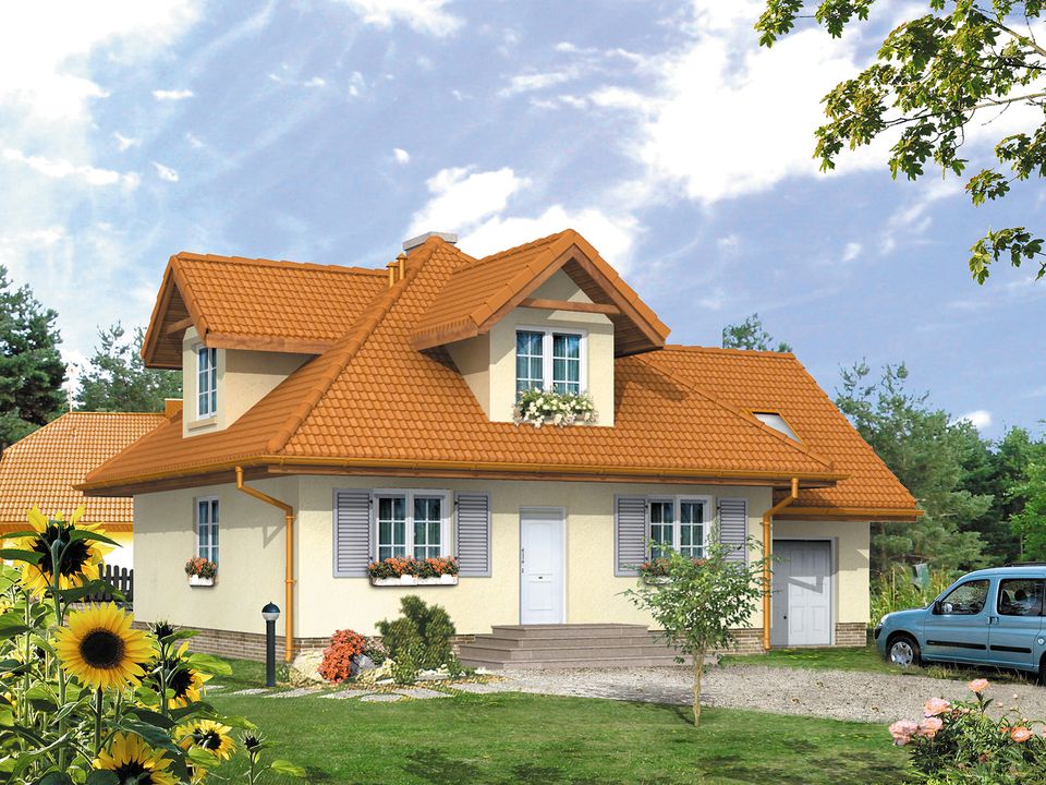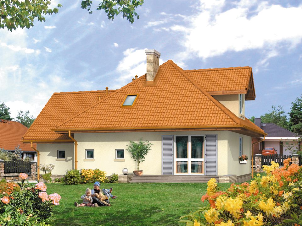 Graficzne opracowanie rzutów poglądowych widocznych na karcie projektu zostało wykonane przez Extradom.pl. Prezentowane przez Extradom.pl wizualizacje wykonane zostały przez autora projektu i należy poczytywać je jedynie za przykład i propozycję wykończenia, wizję architektoniczną autora projektu. Ostateczne wykończenie budynku może nastąpić na wiele sposobów. Szczegółowe rozwiązania zastosowane w oferowanej dokumentacji - w tym również ilość, lokalizacje i wygląd okien, drzwi, kominów - mogą w niewielkim stopniu różnić się od prezentowanej wizualizacji budynku.